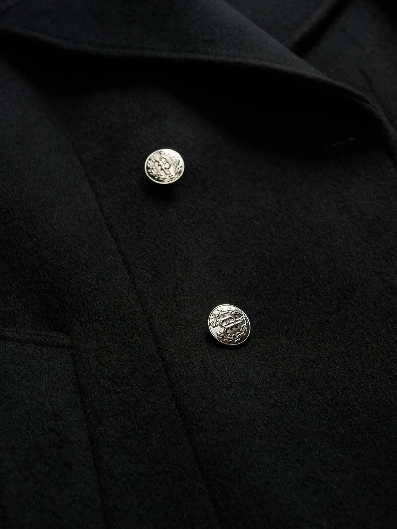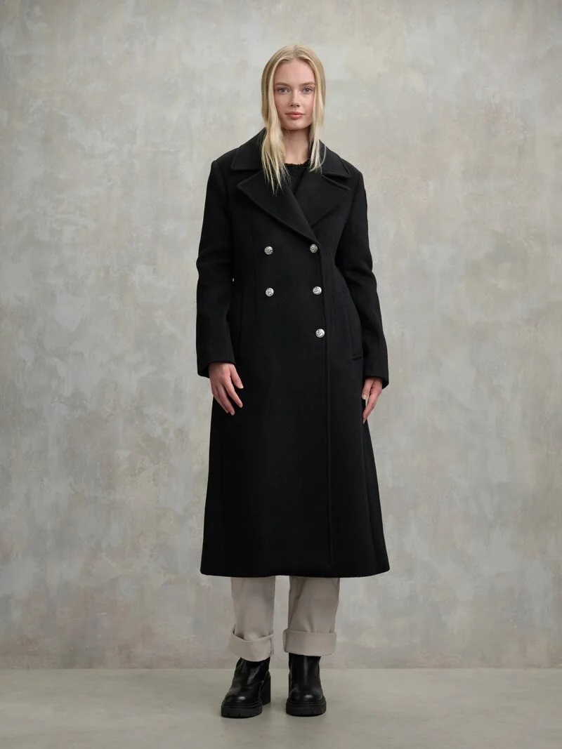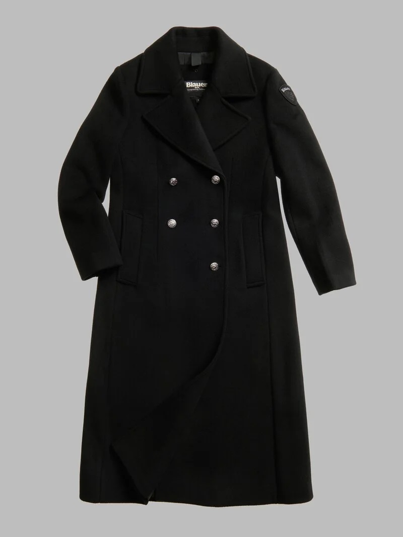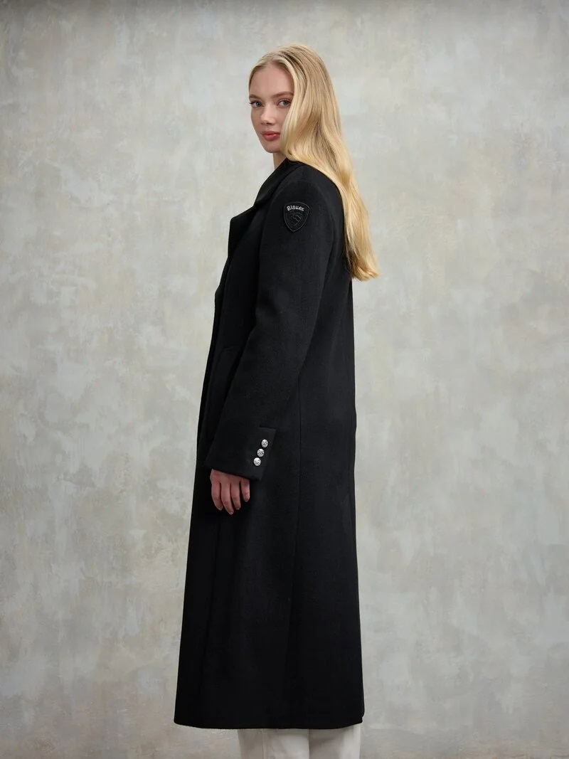 Cappotto doppiopetto in lana monocolore caratterizzato da revers classico. Capo ad ispirazione militare da gusto raffinato ed elegante • Colletto a revers • Realizzato in lana • Foderato in tono • Chiusura con bottoni a chiodo decorati • Due tasche davanti • Tasca interna con velcro • Spacco sul fondo dietro • Patch scudo con logo