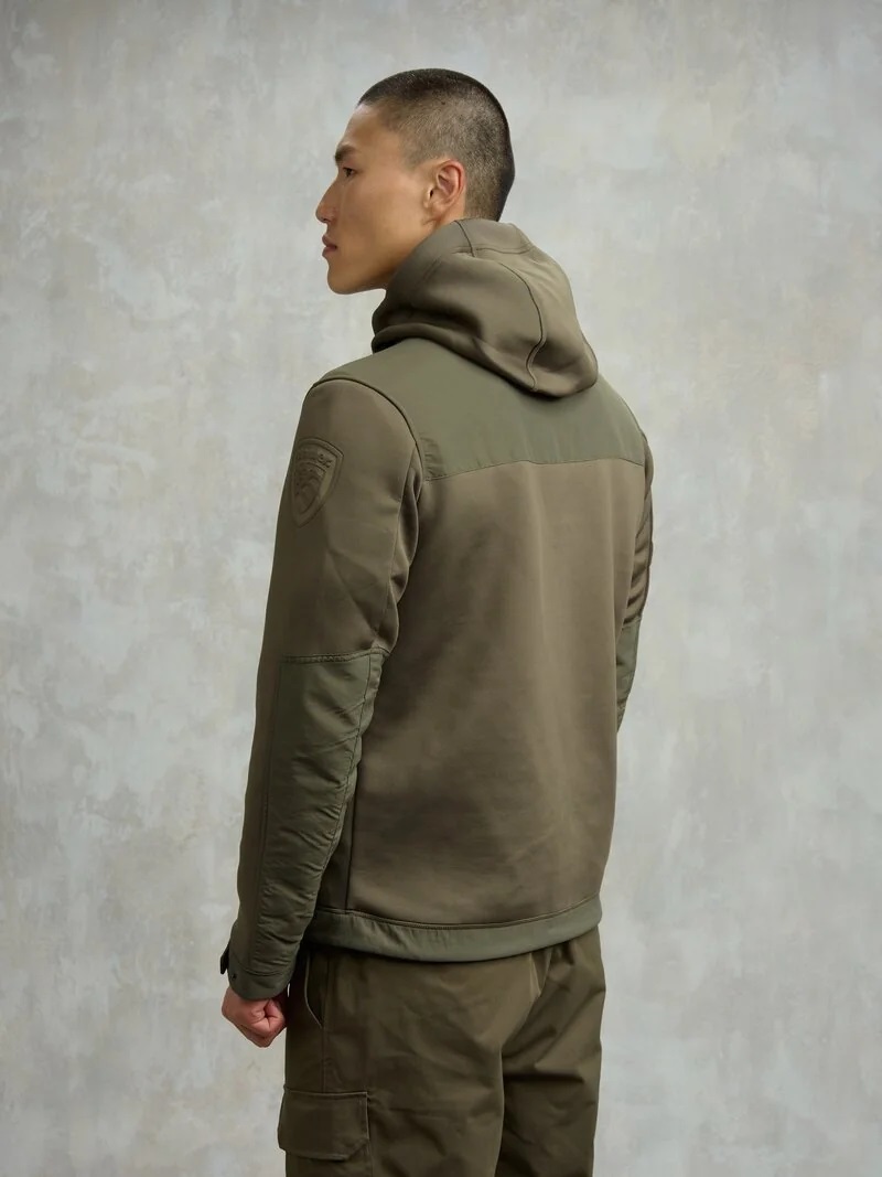 Felpa con cappuccio aperta sul davanti in tessuto scuba leggermente elasticizzato. Inserti in taslan lucido in tono. Tessuto resistente allo schiacciamento e alla stropicciatura.