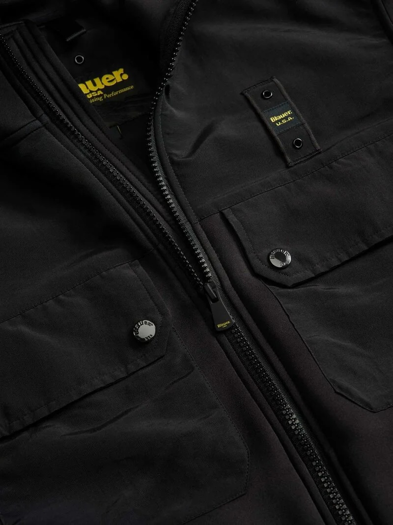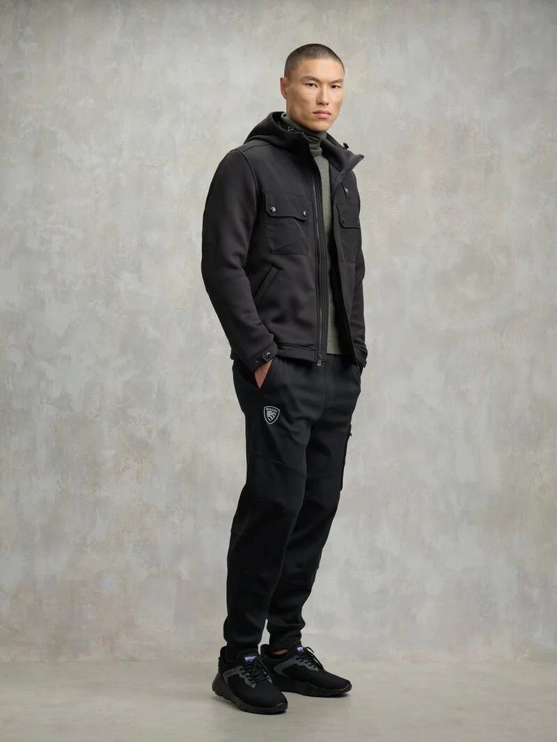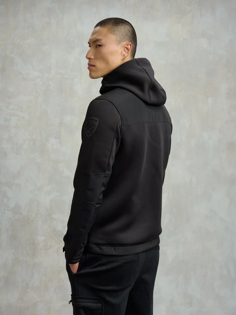 Felpa con cappuccio aperta sul davanti in tessuto scuba leggermente elasticizzato. Inserti in taslan lucido in tono. Tessuto resistente allo schiacciamento e alla stropicciatura.