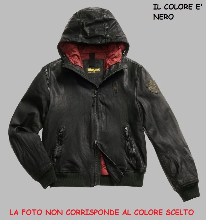 Giubbetto in pelle foderato con cappuccio fisso. Maglia a costine elasticizzate sui polsini e sul fondo, Interno in contrasto colore leggermente imbottito ed impunturato a quadri. • Chiusura con zip centrale • Tasche frontali con zip • Copri cursore sul collo • Tasche interne con velcro • Patch e passante con logo