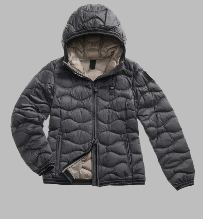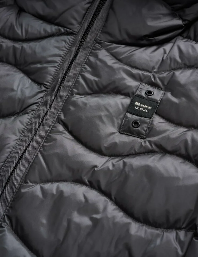 Piumino idrorepellente trapuntato ad onde orizzontali dal taglio svasato. Capo iconico Blauer con imbottitura naturale, calda e non ingombrante. • Cappuccio fisso con elastico rigato • Realizzato in nylon lucido • Foderato in nylon contrasto colore • Imbottito piuma 90/10 gr.150 • Chiusura con zip nascosta • Copri cursore sul collo • Tasche con zip • Elastico rigato sul fondo e sui polsini • Tasca interna con velcro • Patch con glitter e passante con logo