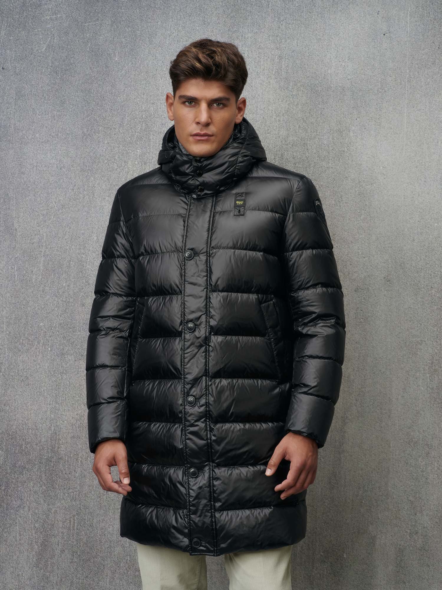 BLAUER PIUMINO LUNGO UOMO Piumino lungo idrorepellente trapuntato a linee orizzontali con colletto removibile tramite zip. • Cappuccio removibile • Realizzato in nylon lucido • Foderato in nylon in contrasto • Imbottito piuma 90/10 gr.250 • Chiusura con zip e bottoni • Tasche con automatico • Tasche interne con velcro • Fondo manica doppio con elastico interno • Patch e passante con logo