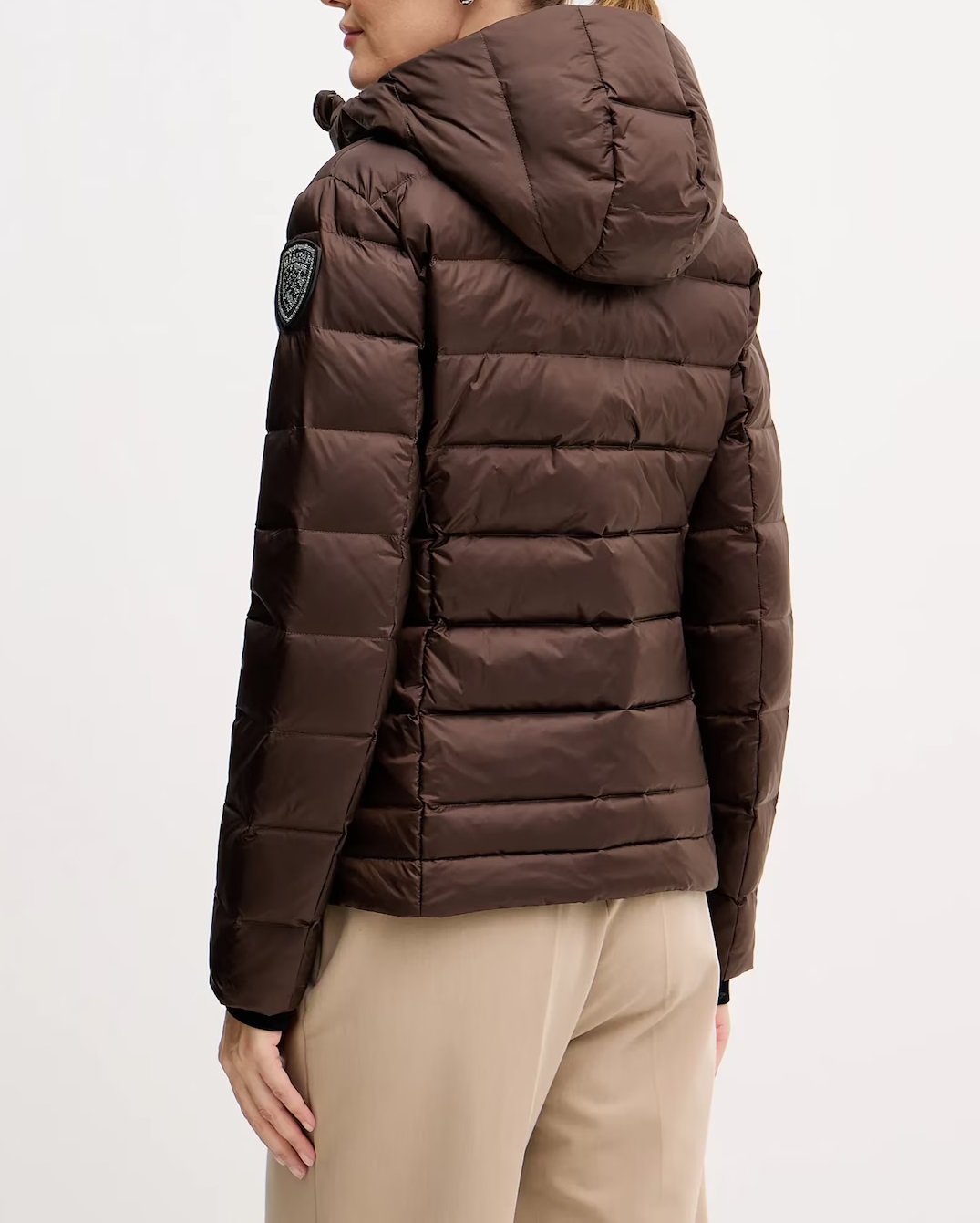 Piumino idrorepellente trapuntato a righe orizzontali. Capo con imbottitura leggera, calda e non ingombrante, dai colori fashion e dal taglio che risalta il punto vita. • Cappuccio fisso con coulisse • Realizzato in nylon lucido • Foderato in nylon contrasto colore • Imbottito piuma 90/10 gr.165 • Chiusura con zip nascosta • Copri cursore sul collo • Tasche con zip • Tasche interne con velcro e zip. • Coulisse sul fondo • Patch glitterato e passante con logo