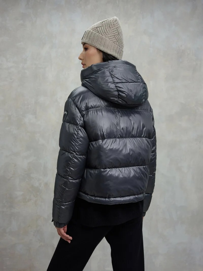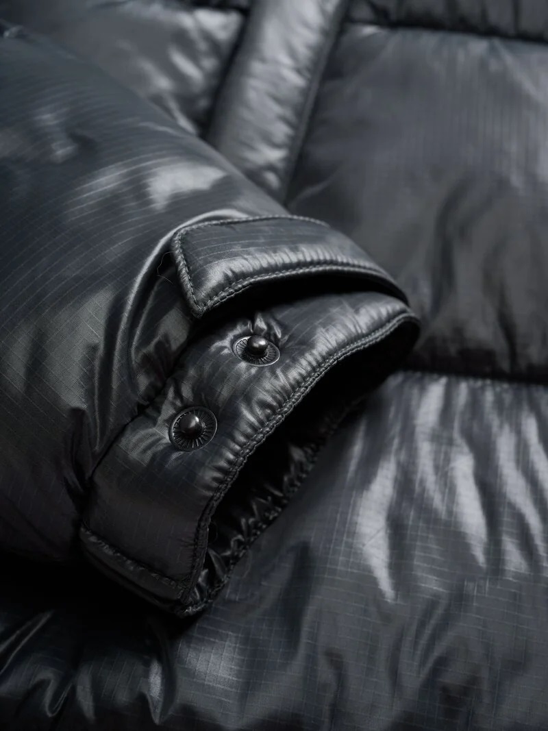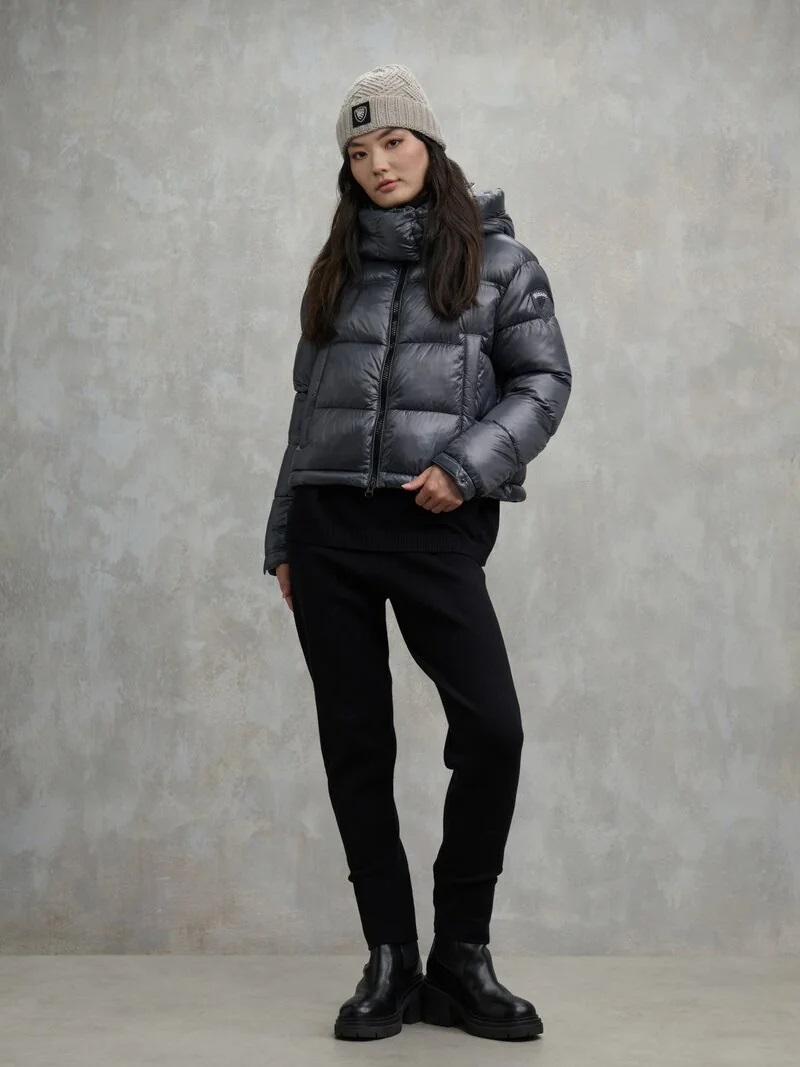 Giubbetto invernale in nylon micro rip idrorepellente con colletto alto removibile. Imbottitura sostenibile con impuntura a righe orizzontali con interno in contrasto colore per abbinare il giubbetto con eleganza e calore.