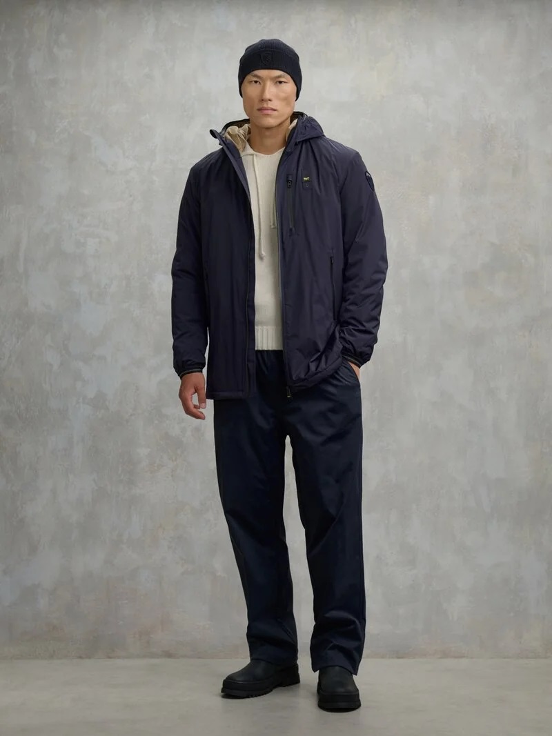 Giubbetto lungo in nylon doppio strato, liscio leggero ed idrorepellente con cappuccio fisso. Interno in morbida pelliccia ecologica in contrasto colore che dona calore e morbidezza. Taschino con zip spalmata sul petto. • Cappuccio fisso con elastico rigato sul profilo • Interno in pelliccia ecologica • Copri cursore sul collo • Chiusura con zip spalmata • Tasche con zip spalmata • Polsino con elastico rigato • Tasche interne con velcro • Patch e passante con logo
