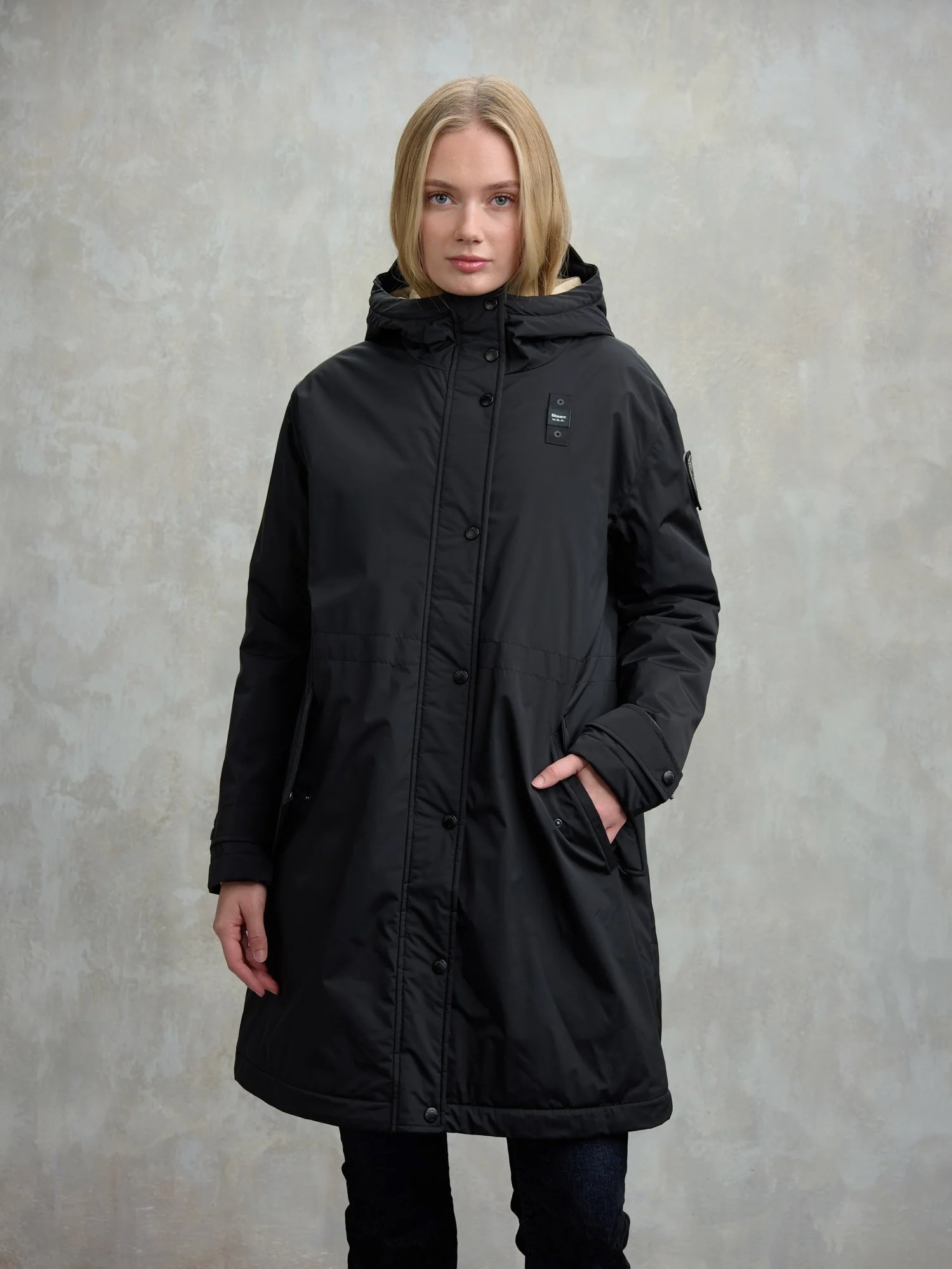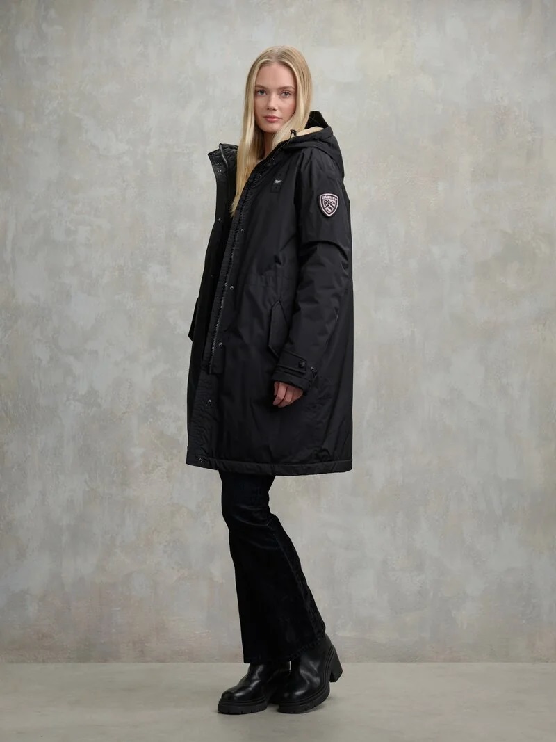 Parka lungo in nylon liscio leggero e idrorepellente con cappuccio fisso. Interno in morbida pelliccia ecologica in contrasto colore che dona calore e morbidezza. Coulisse in vita per dare al capo un effetto arricciato. • Cappuccio fisso con frontino • Interno in pelliccia ecologica • Chiusura con zip e automatici • Tasche con automatico • Tasche interne con velcro • Patch e passante con logo