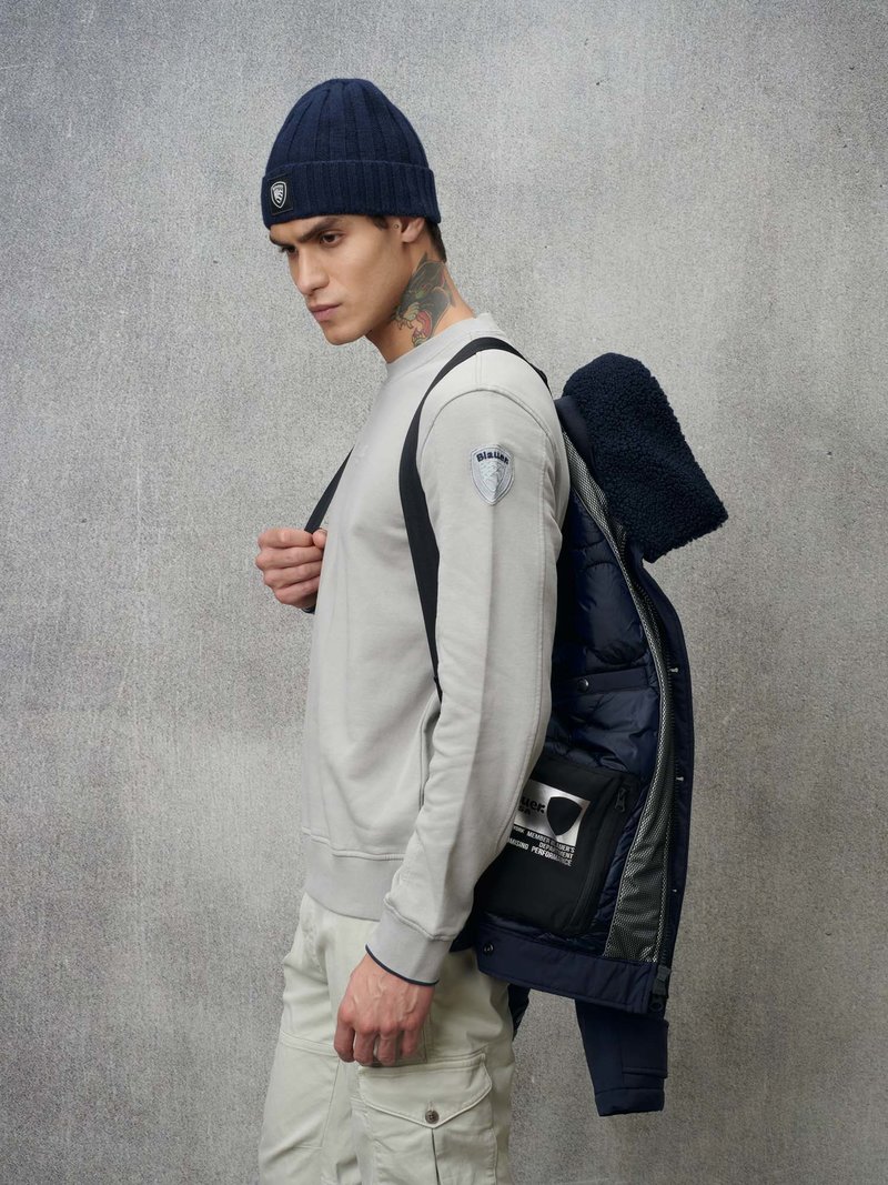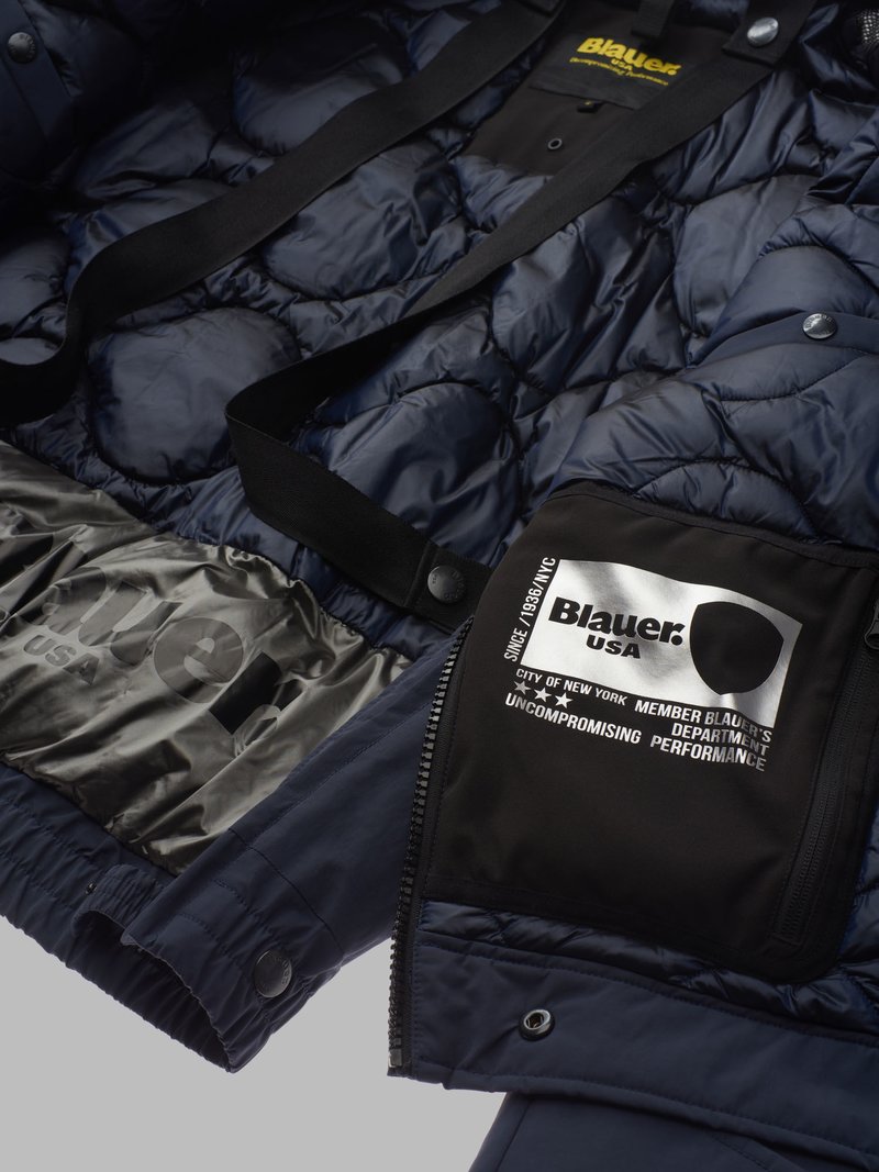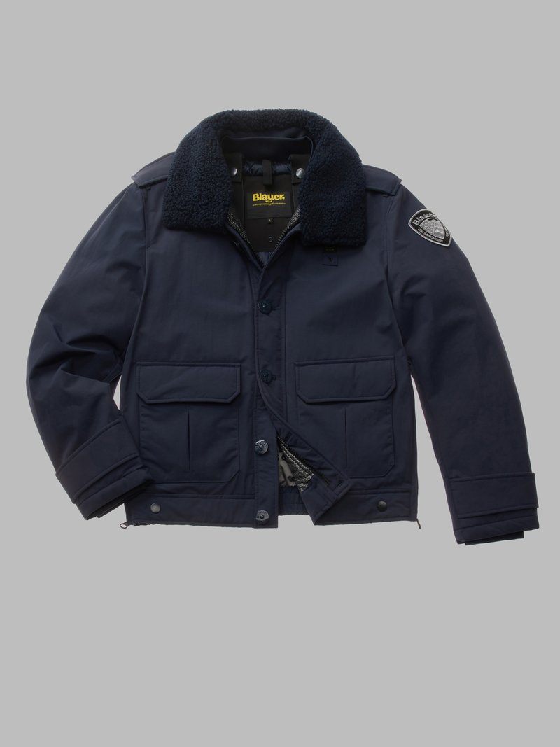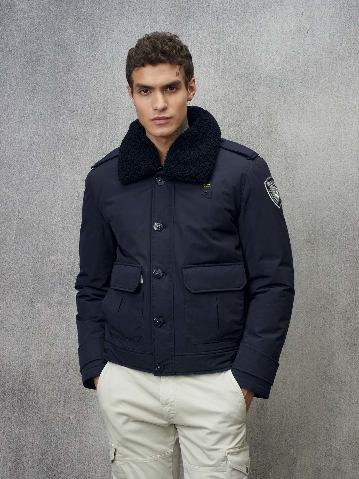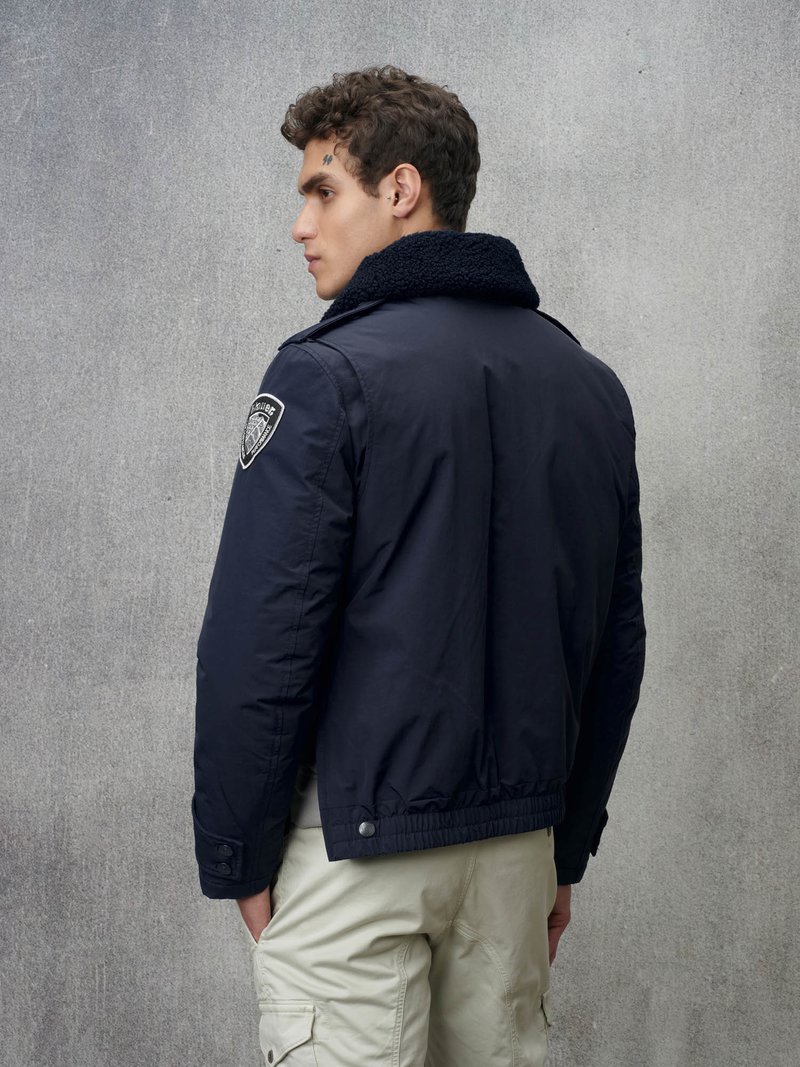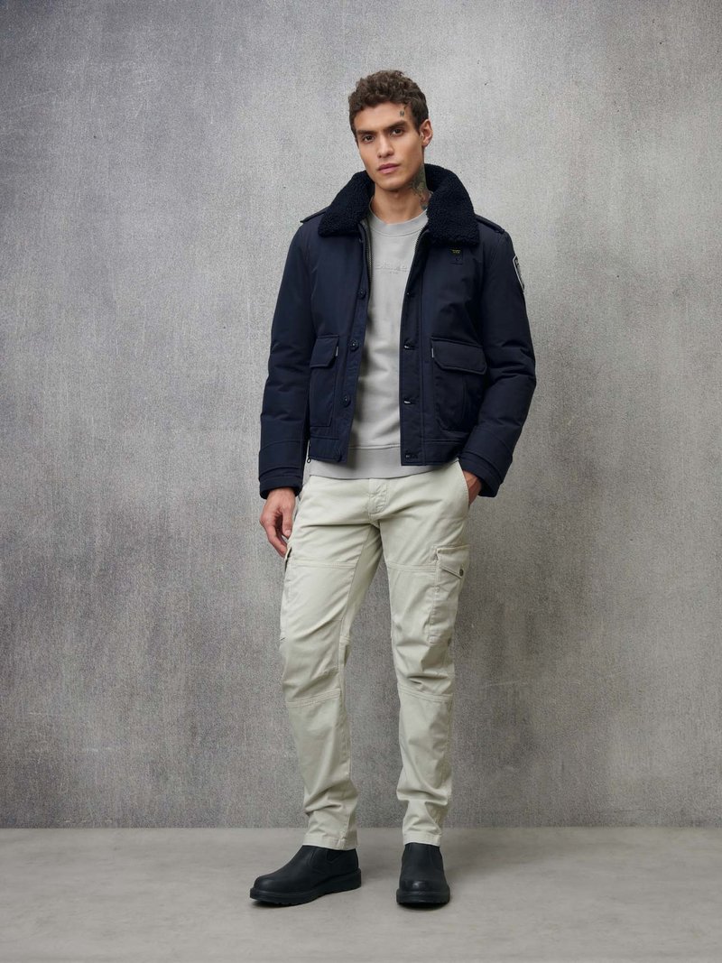 BLAUER PIUMINO UOMO Giubbetto idrorepellente con imbottitura sostenibile. Colletto in pelliccia ecologica simil montone che può essere tolto in caso di necessità. Pratiche bretelle removibili per portare il giubbetto comodamente sulle spalle e lasciare le mani libere. Capo ricercato che combina l’ambiente miliare allo stile Urban. • Colletto in pelliccia eco removibile • Realizzato in taslan di nylon • Foderato in nylon in tono • Imbottito ovatta Sorona® Aura • Chiusura con zip nascosta da bottoni a chiodo • Tasche doppie con automatici • Fondo manica con linguetta • Fondo manica doppio con costina elastica • Fascetta riflettente nascosta • Bretelle removibili porta giacca • Spacco con zip e linguetta sui fianchi • Tasche interne con zip • Patch e passante con logo