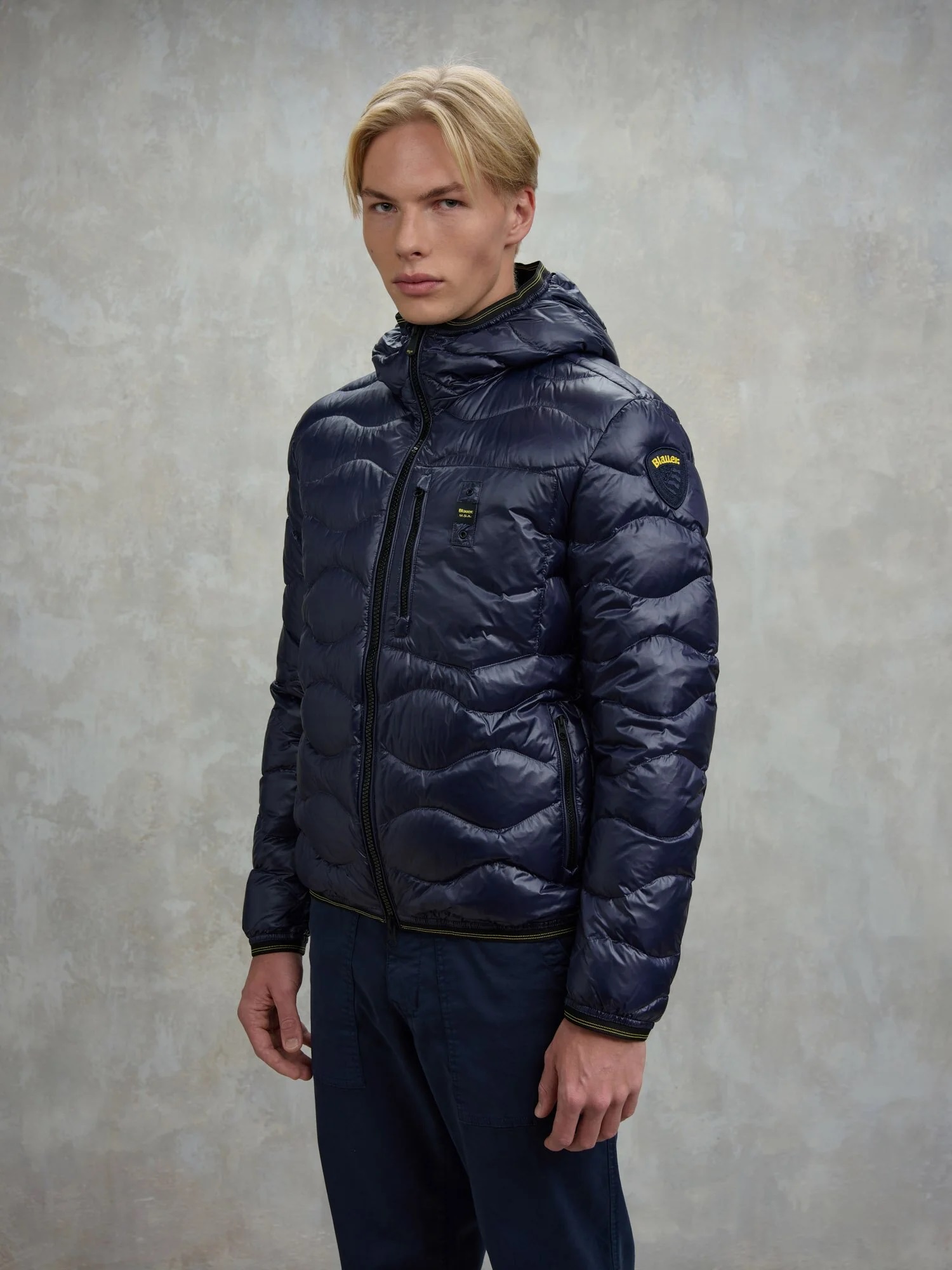 Piumino trapuntato ad onde orizzontali. Taschina applicata sul petto a sinistra per donare al capo iconico Blauer un tocco più funzionale. Imbottitura naturale in piuma, calda e non ingombrante; dedicato a chi vuole essere sempre alla moda in ogni occasione.