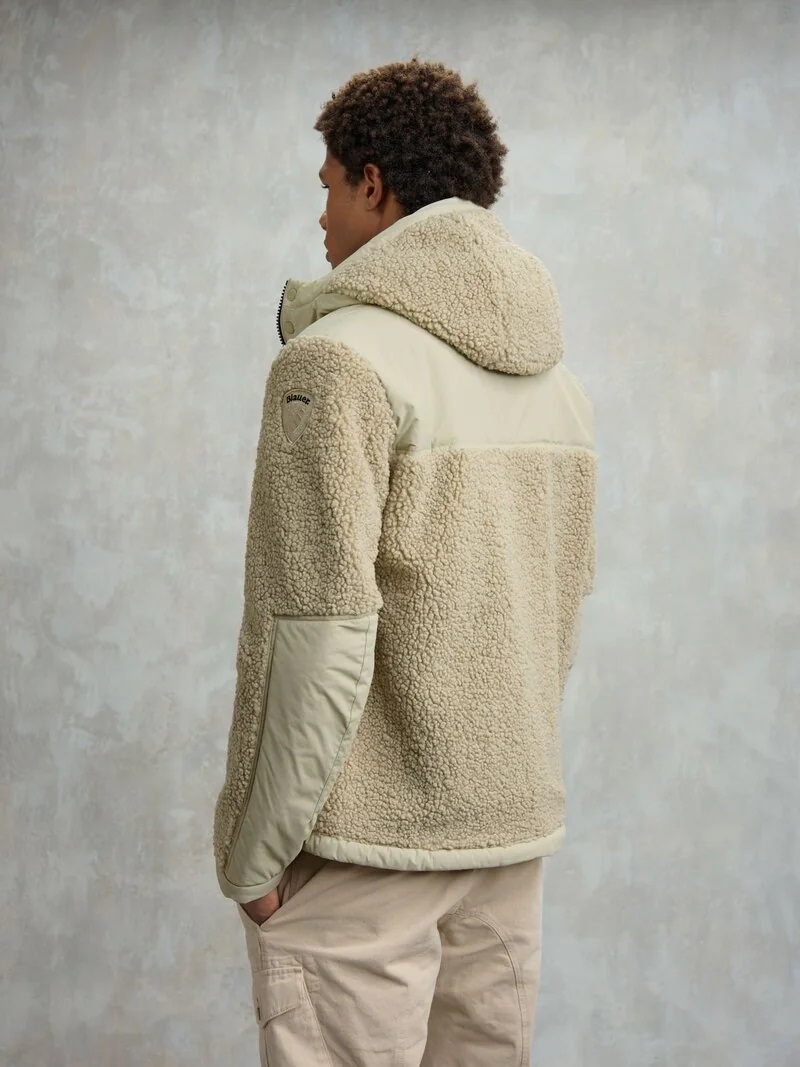 Giubbetto con cappuccio in pelliccia di montone ecologico con dettagli in taslan. Capo informale, facile da abbinare e pratico nell’uso. • Cappuccio fisso in pelliccia e taslan • Chiusura con zip • Tasche con zip e automatici • Tasche interne con velcro e pattina • Coulisse sul fondo • Patch e passante con logo