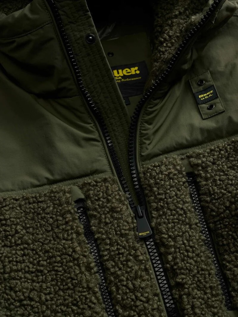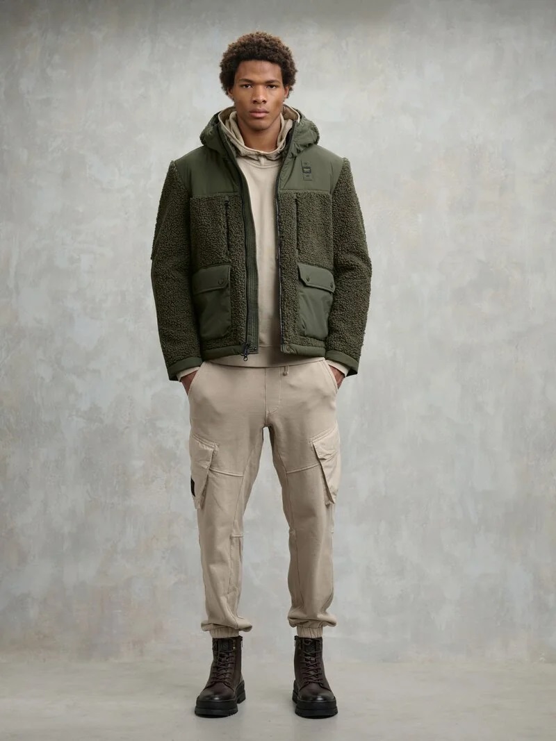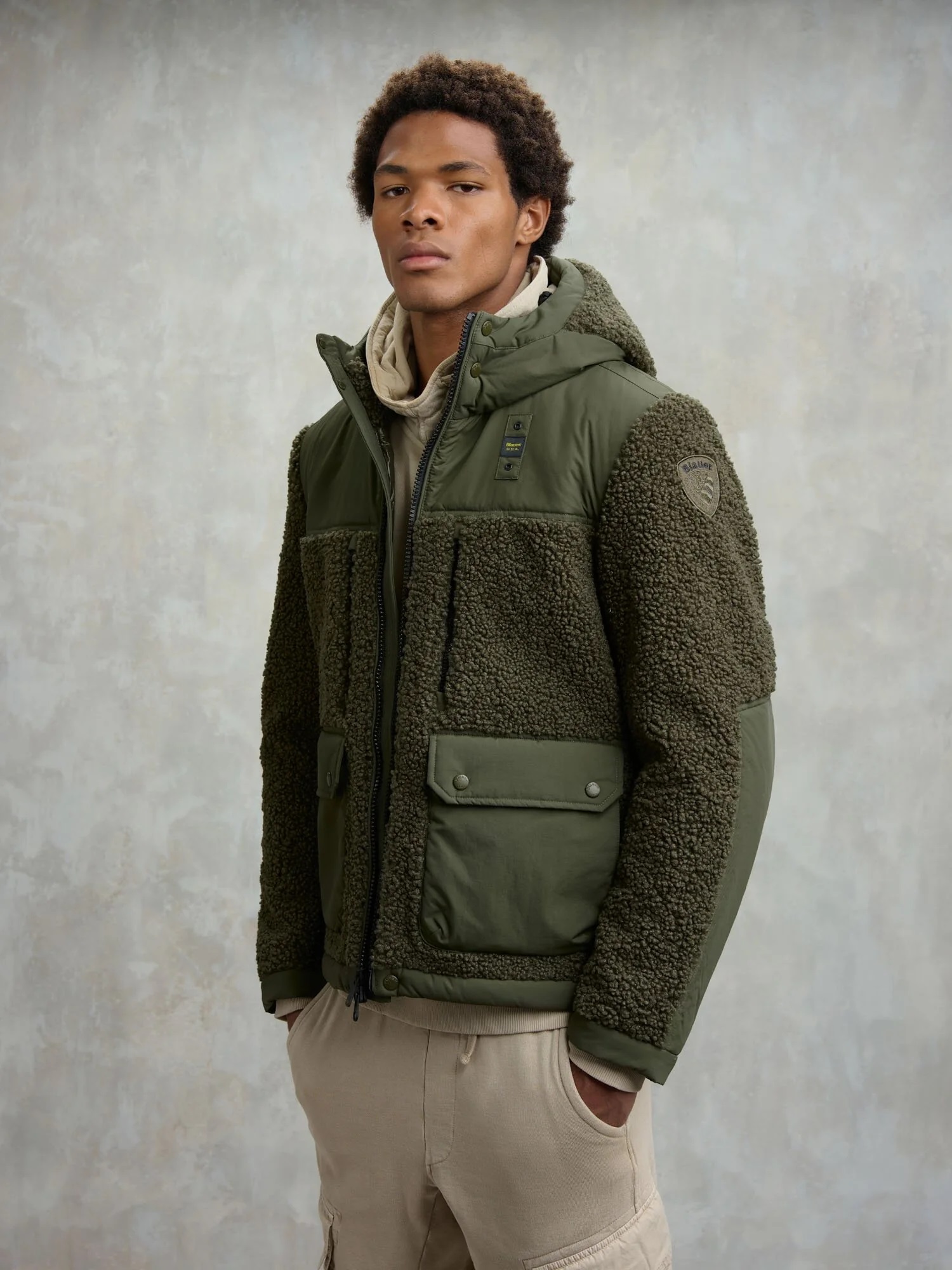 Giubbetto con cappuccio in pelliccia di montone ecologico con dettagli in taslan. Capo informale, facile da abbinare e pratico nell’uso. • Cappuccio fisso in pelliccia e taslan • Chiusura con zip • Tasche con zip e automatici • Tasche interne con velcro e pattina • Coulisse sul fondo • Patch e passante con logo