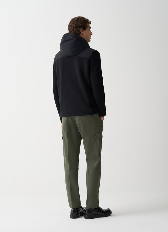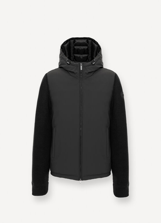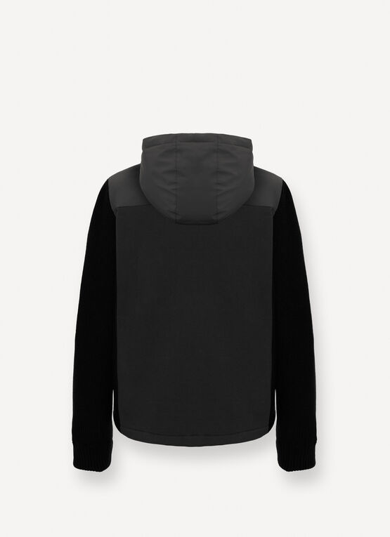 La finitura liscia, unita alla maglia e alla felpa, crea un contrasto che esalta lo stile della giacca ibrida da uomo, ideale per i giorni più freschi.