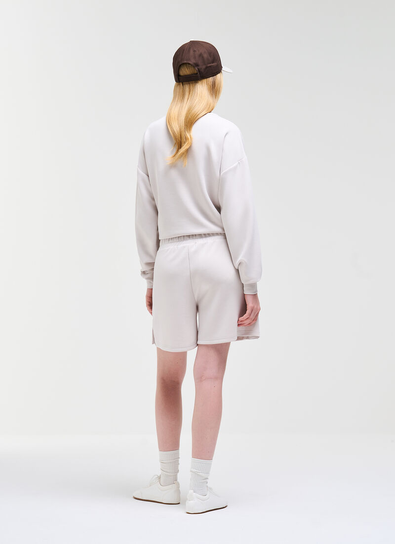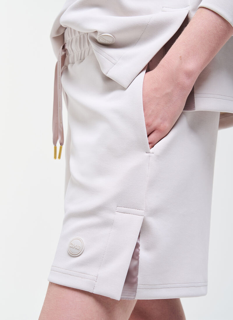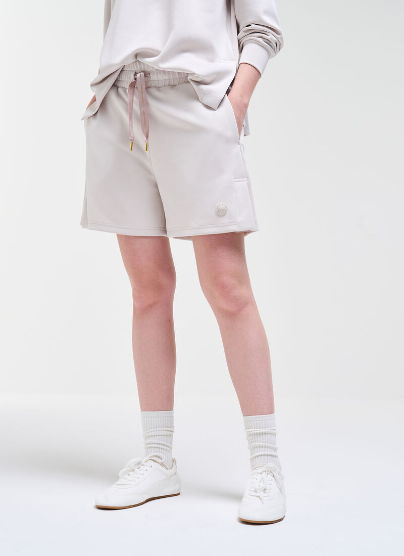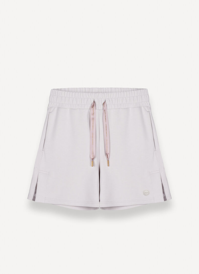 Comodità e stile si fondono in questi pantaloncini da donna, realizzati in interlock di cotone modal con finitura stretch per una sensazione soffice e avvolgente. Il design sportivo è impreziosito da dettagli femminili come la coulisse in vita effetto raso logata e gli spacchetti laterali, che aggiungono un tocco di eleganza discreta. Perfetti da abbinare alla felpa in tessuto 1YH per creare un completo coordinato, ideale anche nelle giornate più calde.
