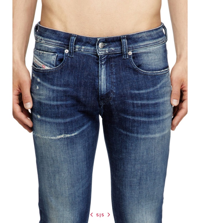 Il capo è realizzato in denim stretch con un lavaggio blu medio. Dettagli in una tonalità più chiara e leggere abrasioni enfatizzano il look vissuto. È parte della selezione DNA di Diesel.