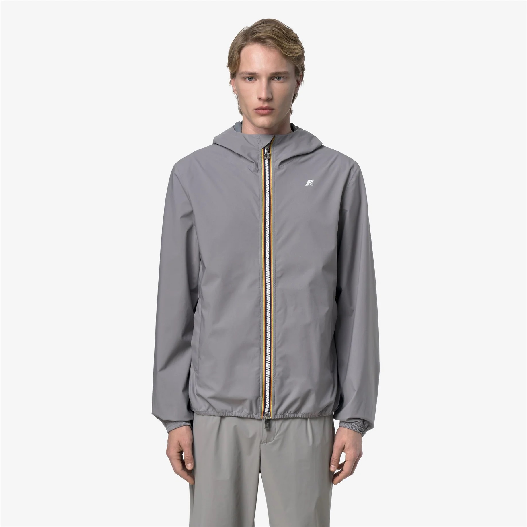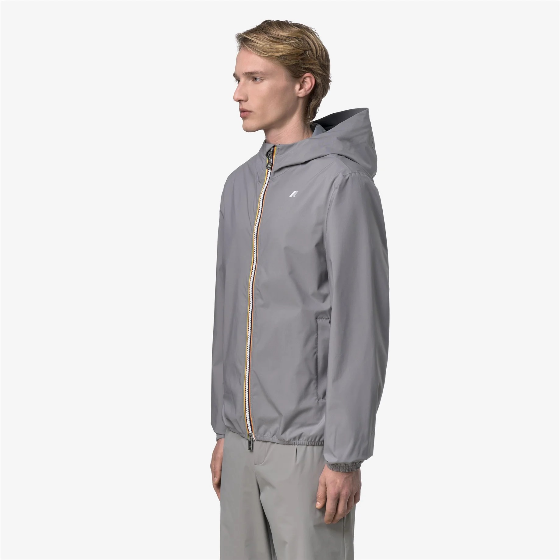 Jack è una giacca corta da uomo ideale per le mezze stagioni e con vestibilità slim, realizzata in tessuto tecnico elasticizzato, che segue i movimenti e protegge dal vento e dalla pioggia fino a 10000 colonne d’acqua. L'interno è foderato con una membrana isolante decorata con lettering K-Way stampato all over in tonalità argento. Le tasche laterali con zip, il cappuccio avvolgente, i polsini e i bordi con inserti elastici sono dettagli funzionali che garantiscono aderenza e una vestibilità comoda e veloce.