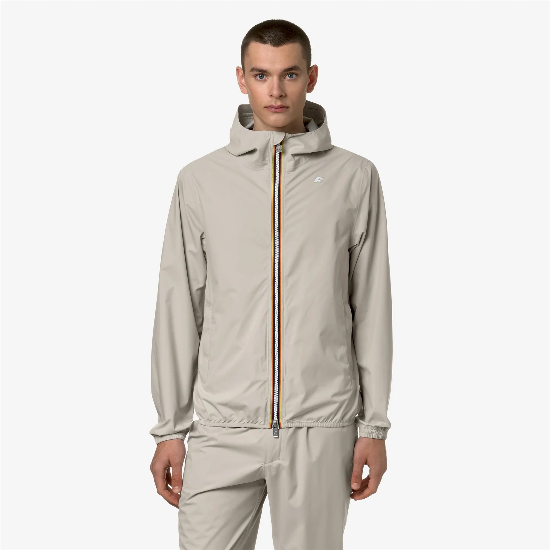 Jack è una giacca corta da uomo ideale per le mezze stagioni e con vestibilità slim, realizzata in tessuto tecnico elasticizzato, che segue i movimenti e protegge dal vento e dalla pioggia fino a 10000 colonne d’acqua. L'interno è foderato con una membrana isolante decorata con lettering K-Way stampato all over in tonalità argento. Le tasche laterali con zip, il cappuccio avvolgente, i polsini e i bordi con inserti elastici sono dettagli funzionali che garantiscono aderenza e una vestibilità comoda e veloce.