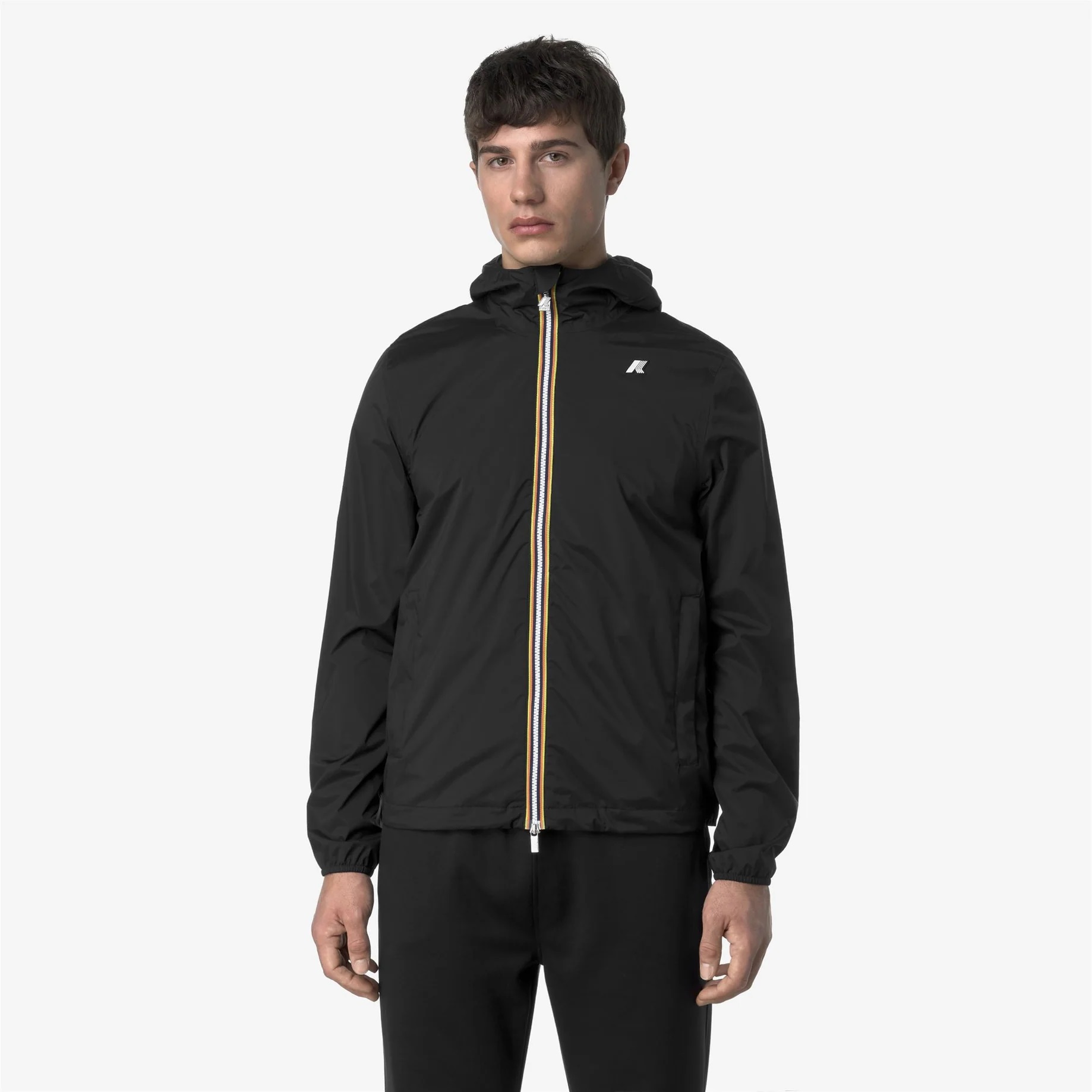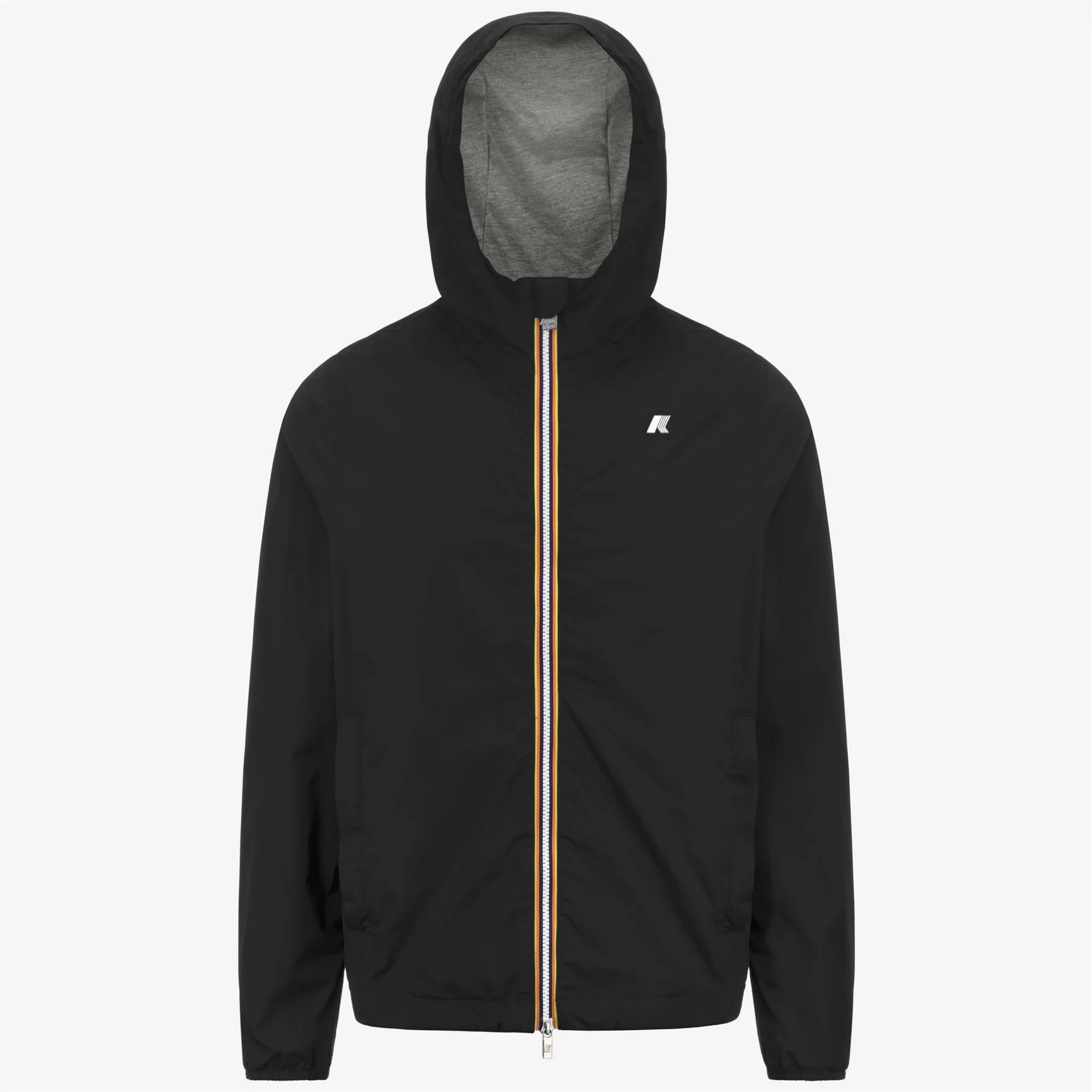Jack è una giacca da uomo con vestibilità slim, realizzata in nylon stretch resistente agli agenti atmosferici e rifinita con una fodera in morbido jersey di cotone grigio melange applicata solo su fronte e retro, per garantire comfort superiore e una piacevole sensazione a contatto con la pelle. L’interno è curato nei dettagli con cuciture termonastrate e l’iconico tape multicolor K-Way applicato al punto vita, che aggiunge una nota distintiva al design.