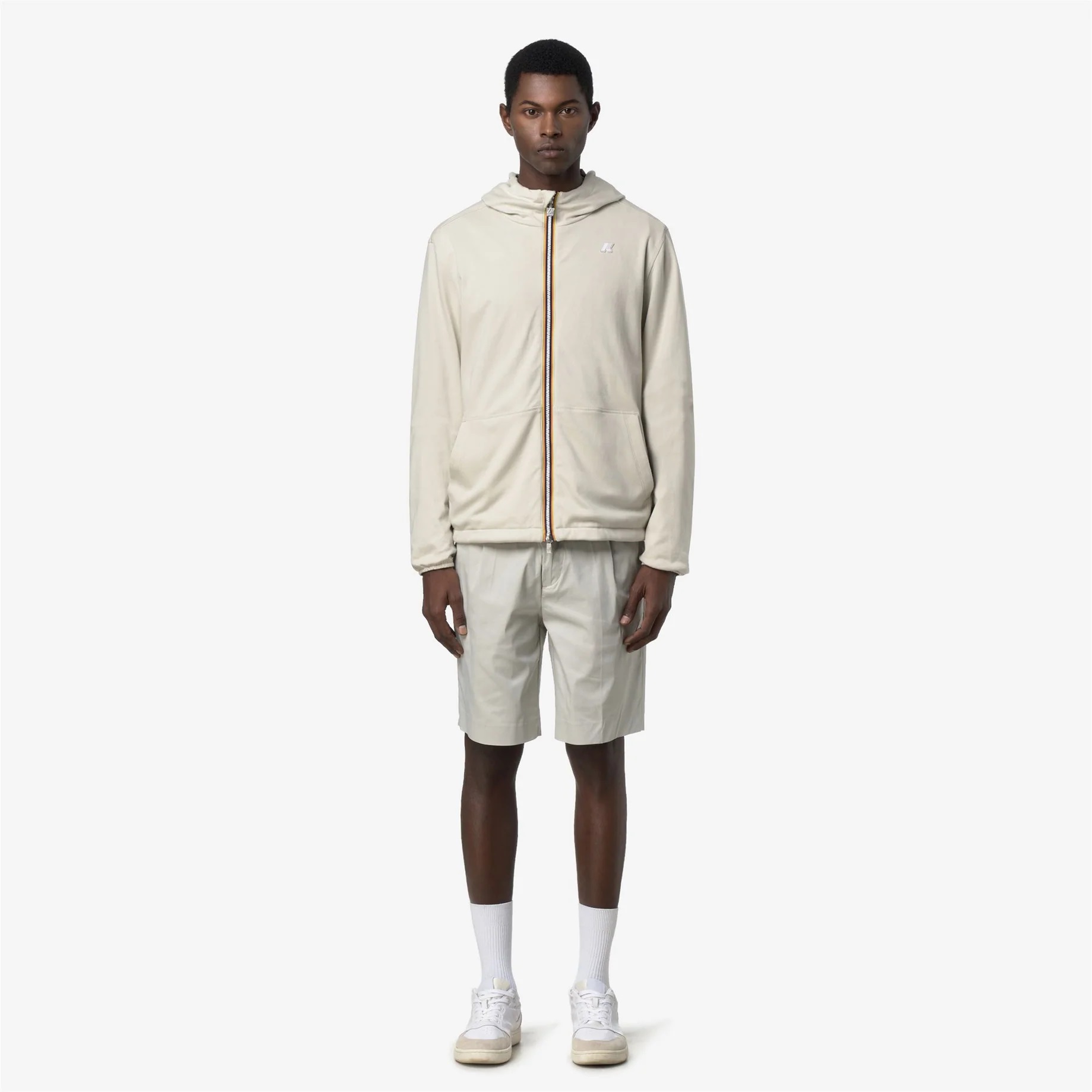 Jake è una giacca corta unisex pensata per uno stile di vita dinamico e per affrontare il clima mutevole primaverile. Il design reversibile combina praticità e attitudine sportiva, con un lato in felpa di cotone morbido effetto scuba e l’altro lato in nylon riciclato resistente all’acqua e traspirante, in colore a contrasto. Il capo è dotato di cappuccio regolabile e tasche da entrambi i lati. Tessuto esterno: interlock 100% cotone Tessuto interno: 100% nylon riciclato waterproof a finitura opaca Impermeabilità tessuto interno: 3000 mm colonna d'acqua Design reversibile Cuciture termonastrate Cappuccio non staccabile regolabile con corda elastica Fondo corpo regolabile con corda elastica Chiusura zip Polsini elasticizzati 1 tasca a marsupio 2 tasche con bottone a pressione Vestibilità slim Logo in silicone bianco