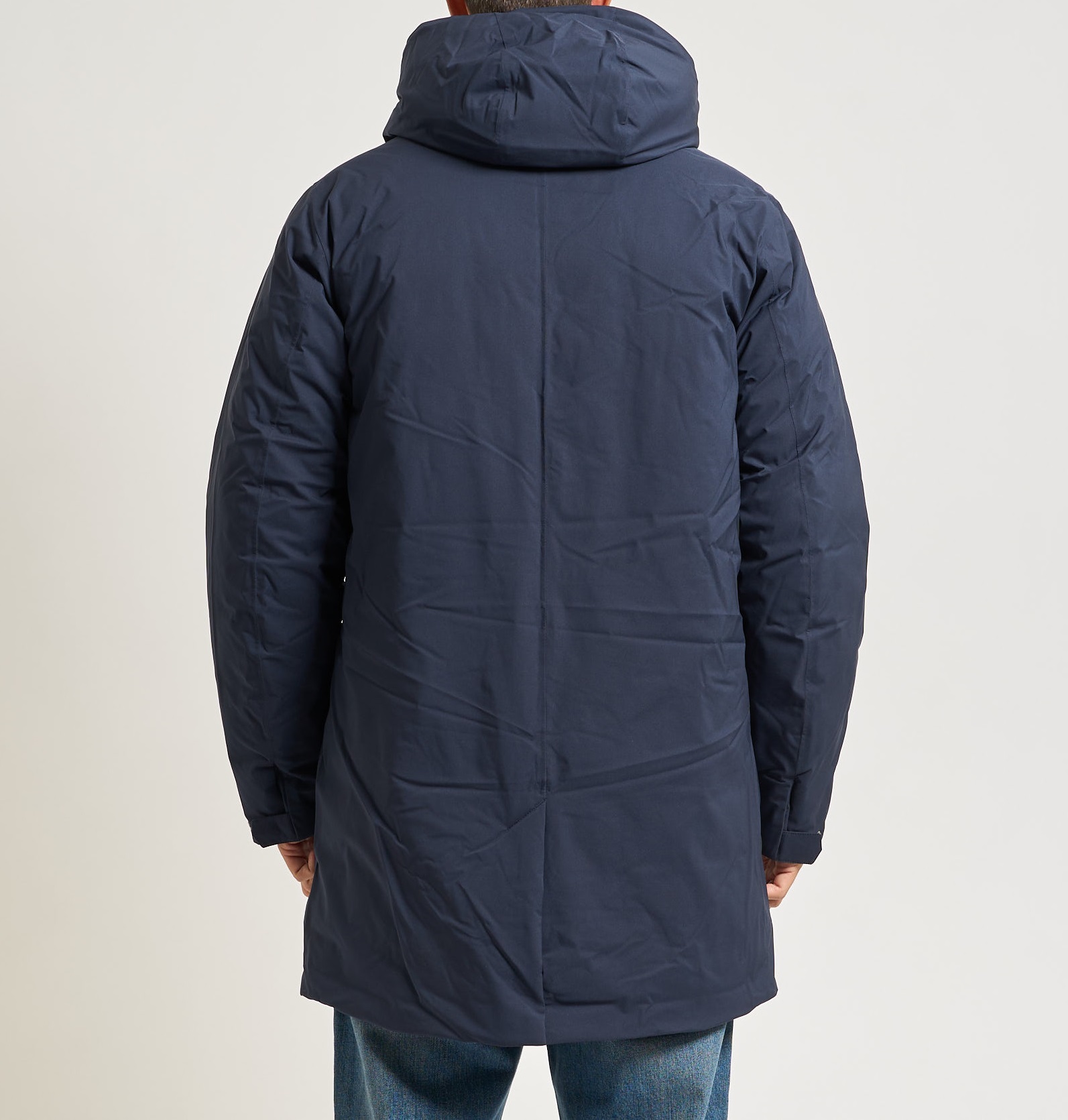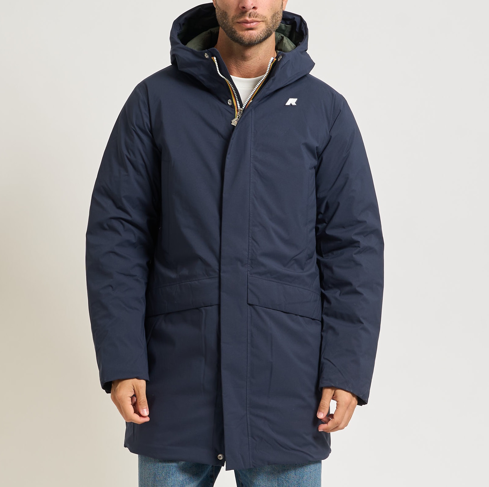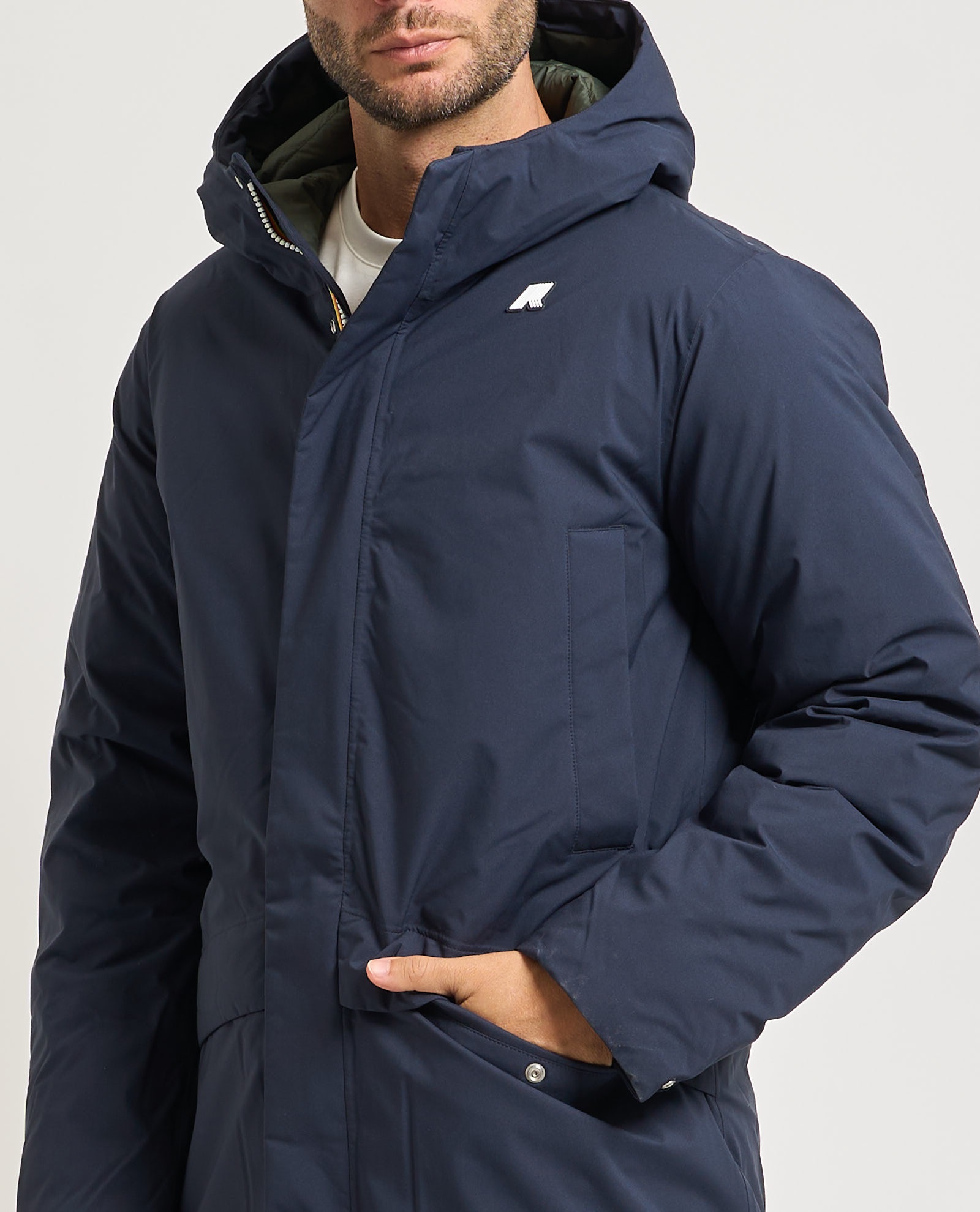 Tessuto eco in poliestere elasticizzato impermeabile, idrorepellente, antivento, traspirante Tessuto nylon trapuntato antivento, traspirante, con tenuta piuma Imbottitura in piuma Grado di calore alto Cuciture termonastrate Cappuccio regolabile con corda elastica Fondo corpo con regolazione Chiusura con zip Polsi con elastico 2 tasche scalda mani sul petto e chiusura con snap 2 tasche con patta in basso con bottoni a pressione Fitting regular Logo in silicone bianco