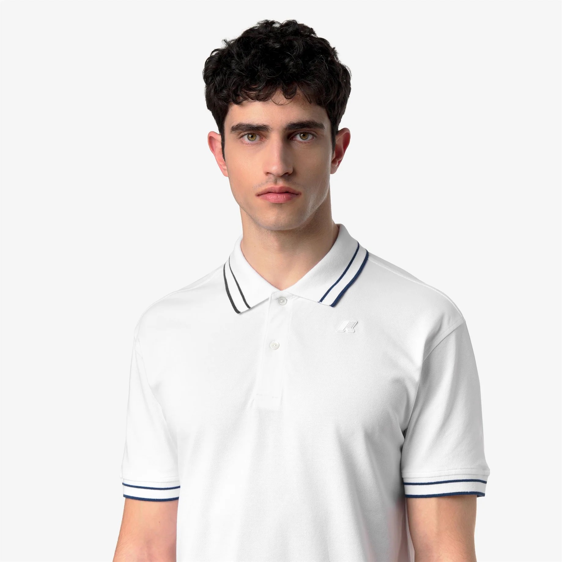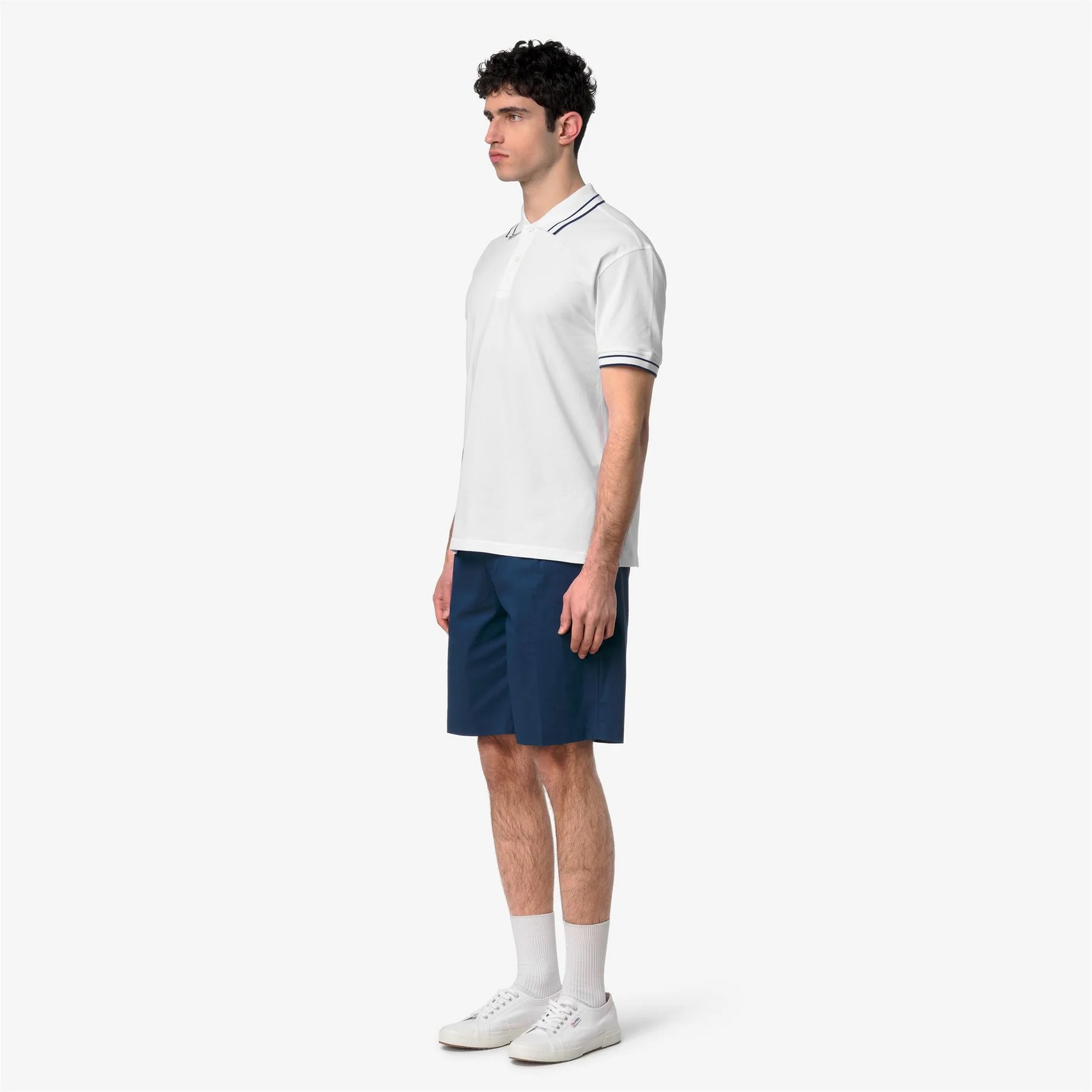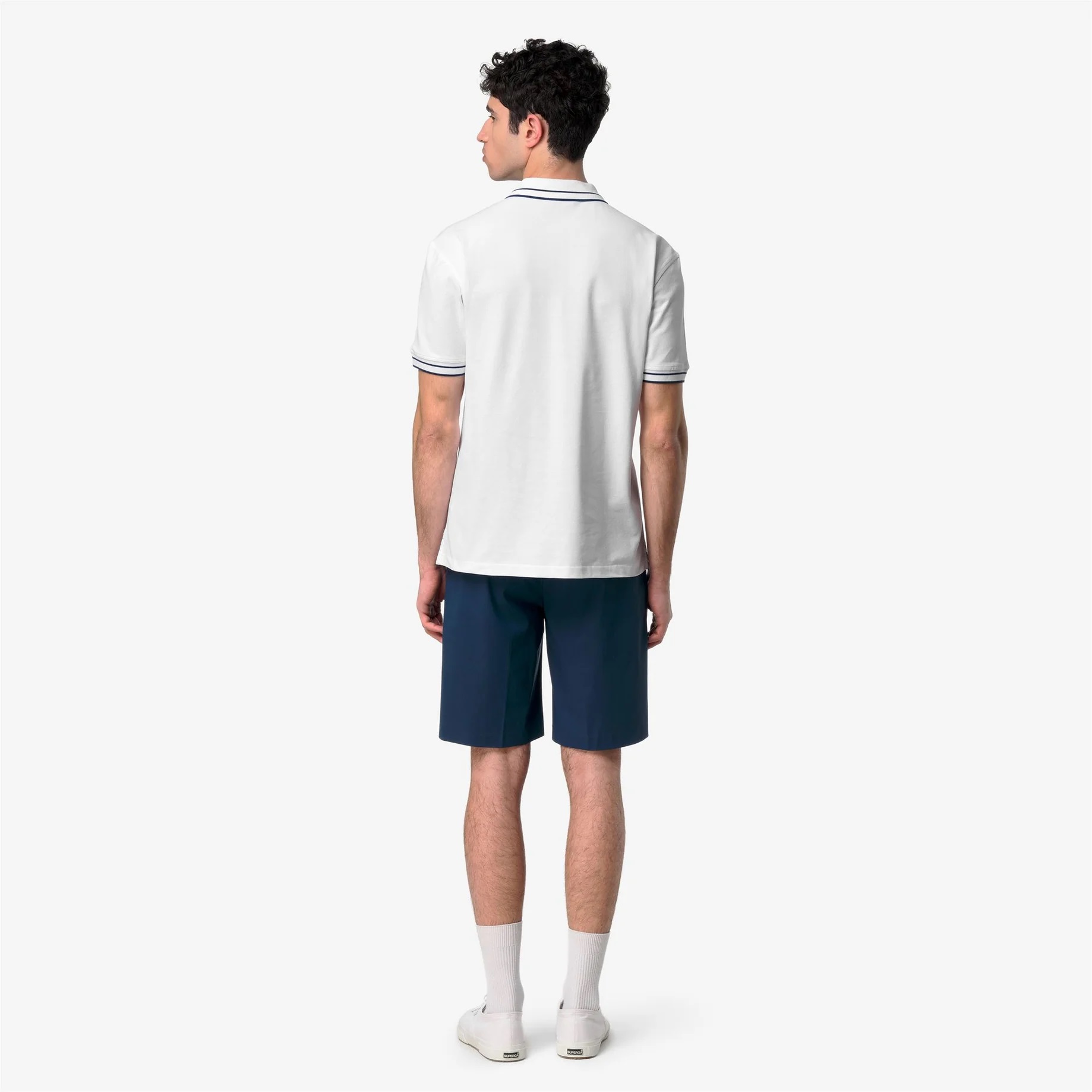 Simor è una polo a maniche corte da uomo. Realizzata in piqué di cotone stretch, ha un look casual con colletto e fondo manica a righe. Tessuto cotone piqué elasticizzato Colletto e fondo manica a costine Apertura frontale a due bottoni Bottoni in madreperla con logo inciso Spacchetti laterali Vestibilità regolare Logo in silicone bianco