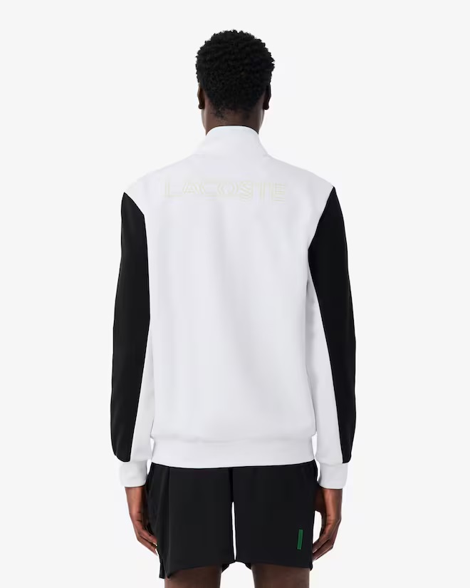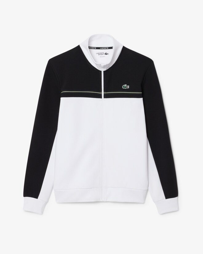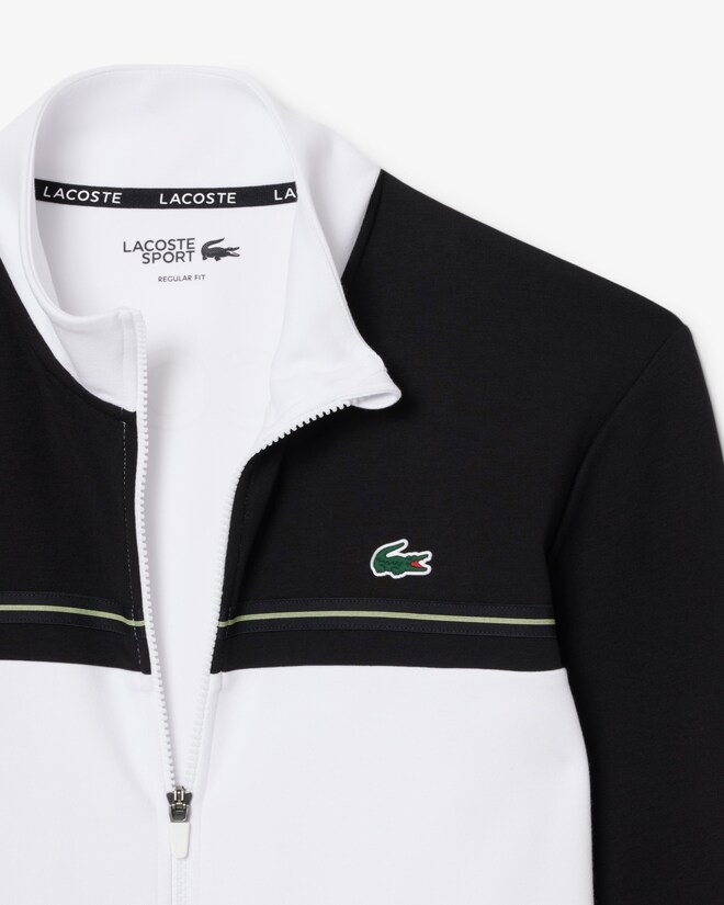 Una felpa con zip ricca di dettagli firmati Lacoste, esperti di sport e stile dal 1933. Realizzata in confortevole tessuto double face in misto cotone, con un caratteristico design color block e marchio stampato. Stile sportivo audace.