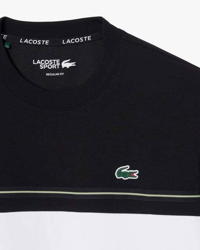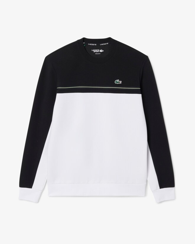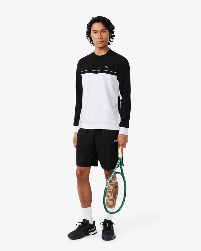 Una felpa tecnica e grafica da indossare tutti i giorni, firmata Lacoste, esperti di sportswear dal 1933. Un design elegante e senza tempo con un taglio confortevole, uno stile iconico color block e dettagli di finitura pregiati. Per un look audace. Piqué double face in cotone organico e poliestere riciclato da scarti di lavorazione Taglio dritto, regular, leggermente affusolato Dettaglio fascia sul davanti Coccodrillo in silicone