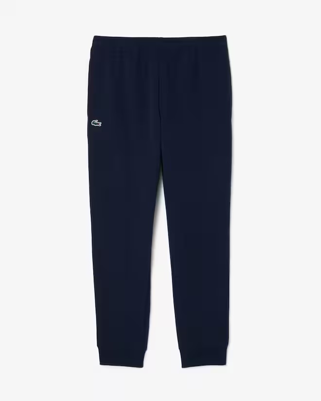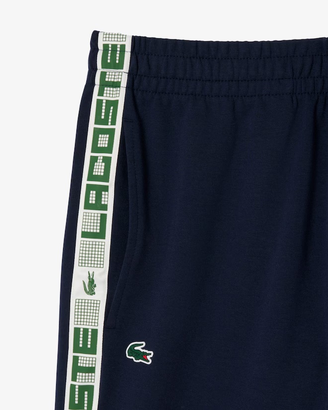 I pantaloni della tuta di Lacoste, esperti di sport e stile dal 1933, sono ricchi di stile all'insegna del coccodrillo. Realizzati in morbido e confortevole tessuto double face di misto cotone, con righe grafiche caratterizzate da logo, coccodrilli e motivi ispirati alla racchetta da tennis. Stile sportivo audace. Tessuto double face in cotone organico e poliestere riciclato Righe con logo lungo la gamba Caviglie a coste Due tasche laterali Coccodrillo in silicone sulla gamba destra Supporto principale: Poliestere (71%), Cotone (25%), Elastan (4%) / Fondo tasca: Cotone (60%), Poliestere (40%) / Bordo a costine fondo: Cotone (58%), Poliestere (39%), Elastan (3%)