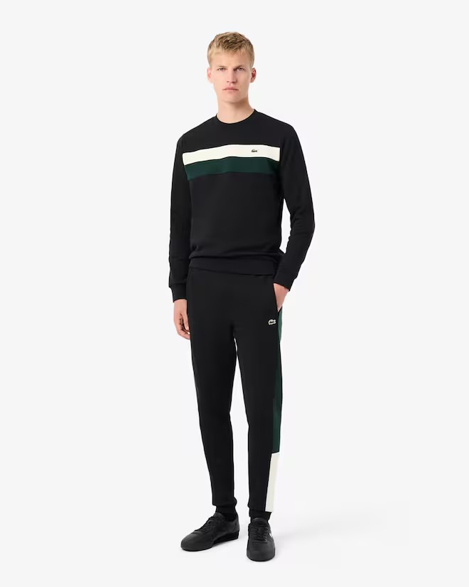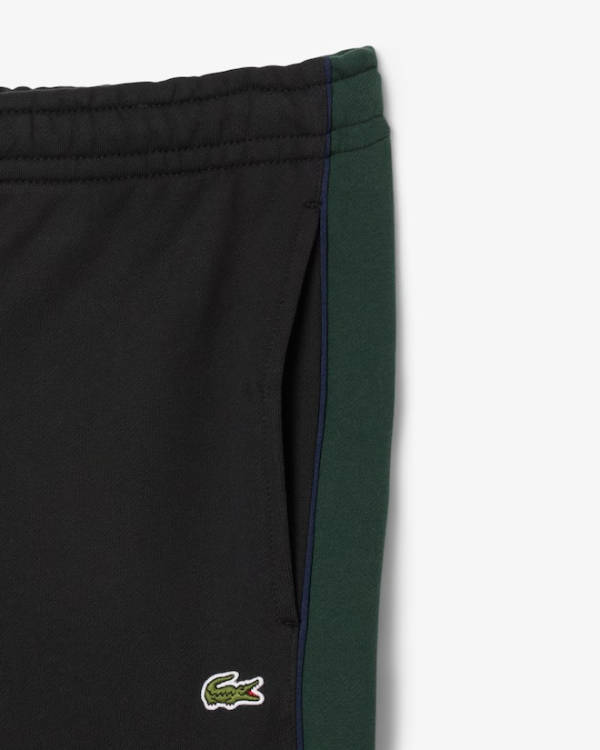 Questi pantaloni della tuta di Lacoste, creatori di sportswear dal 1933, sono una lezione di design all'avanguardia e stile inconfondibile. Realizzati in confortevole cotone felpato con un iconico design color block e finiture a contrasto per un effetto sorprendente. Il connubio perfetto tra moda e sportswear, rifinito con l'iconico coccodrillo ricamato. Cotone felpato non spazzolato Taglio affusolato Pannelli color block tagliati e cuciti lungo la gamba Bordo a contrasto lungo la gamba Due tasche laterali Coccodrillo ricamato sulla gamba sinistra Supporto principale: Cotone (100%) / Bordo a costine fondo: Cotone (98%), Elastan (2%)