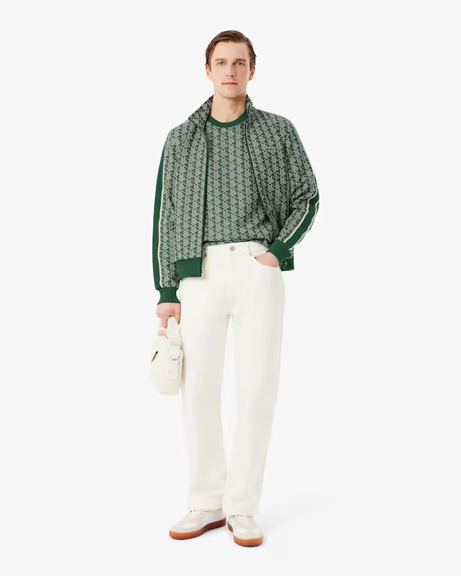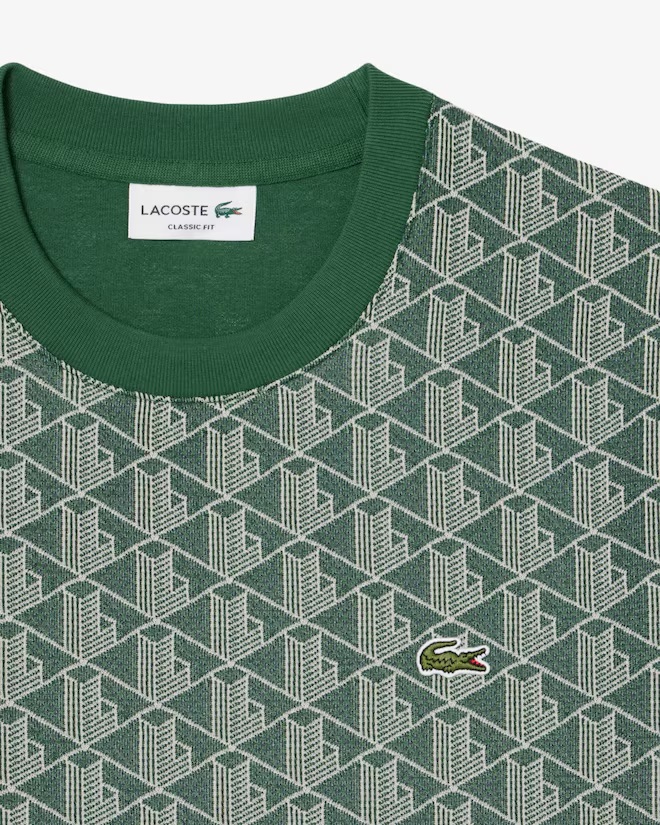 Questa t-shirt è ricca di dettagli firmati Lacoste, creatori di sportswear dal 1933. Realizzata in tessuto a maglia jacquard con iconico motivo con monogramma. Un capo audace con dettagli pregiati, tra cui finiture a coste e un caratteristico coccodrillo ricamato. Maglia con monogramma in jacquard di cotone organico e poliestere riciclato Classic fit, maniche comode Finitura a coste su collo e polsini Monogramma Lacoste all over Coccodrillo ricamato sul petto