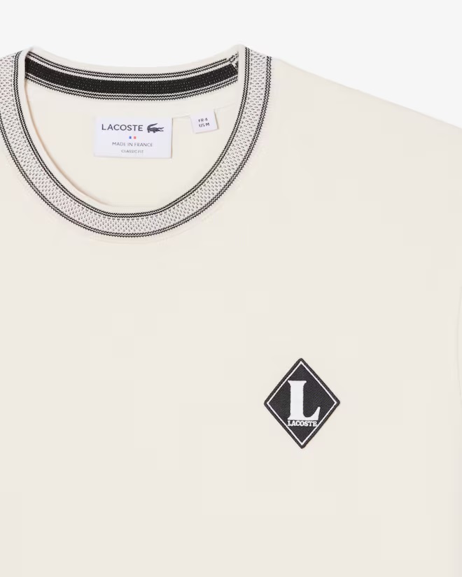 Questa t-shirt è il frutto di 90 anni di eleganza e competenza Lacoste nella maglieria. Realizzata in Francia in comodo jersey di cotone, con tocchi sofisticati tra cui uno stemma rétro con logo e uno scollo testurizzato con sottili dettagli a righe. Uno stile sofisticato, rifinito con il tradizionale coccodrillo ricamato. Tessuto in jersey di cotone organico Classic fit, maniche comode Stemma a losanga in piqué con logo ricamato sul petto Collo testurizzato a righe Coccodrillo ricamato sotto il collo sul retro
