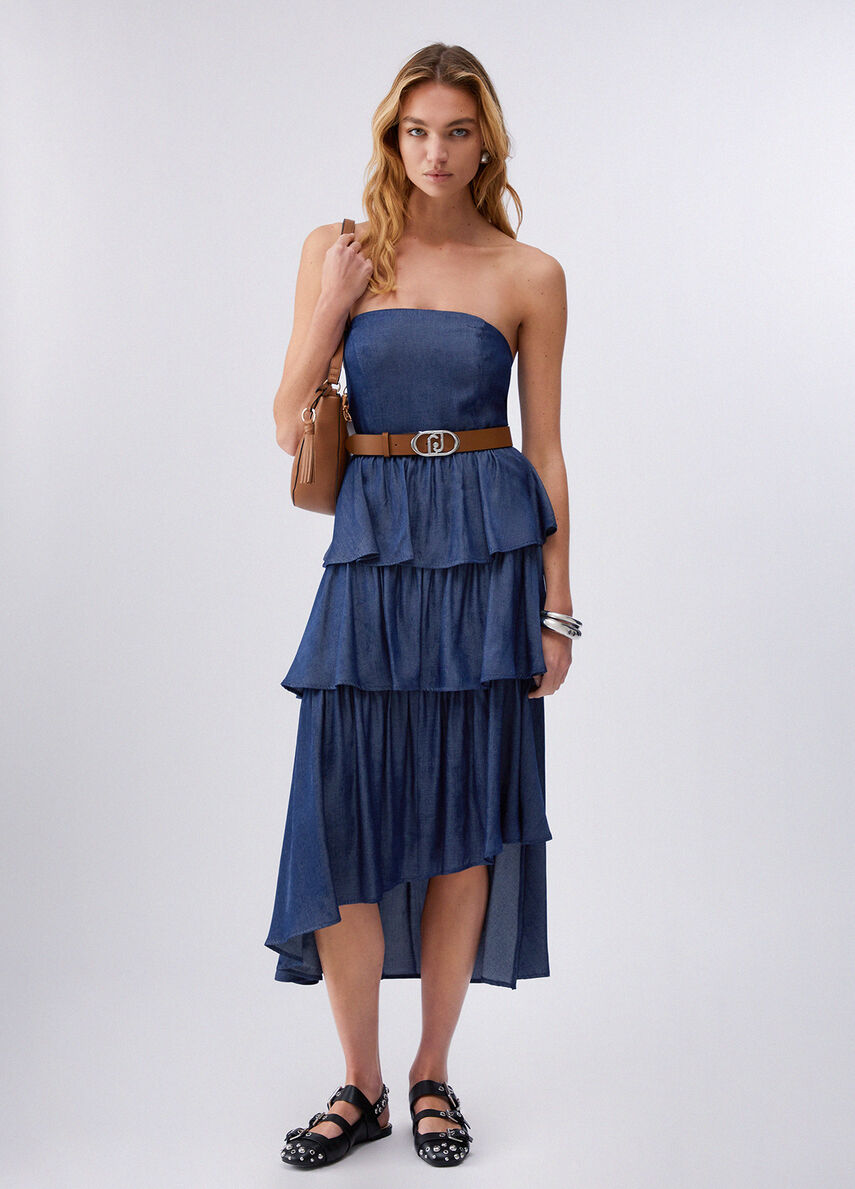 Abito midi in denim chambray no-stretch Taglio bustier Balze asimmetriche Chiusura con zip nascosta Cintura in tono colore