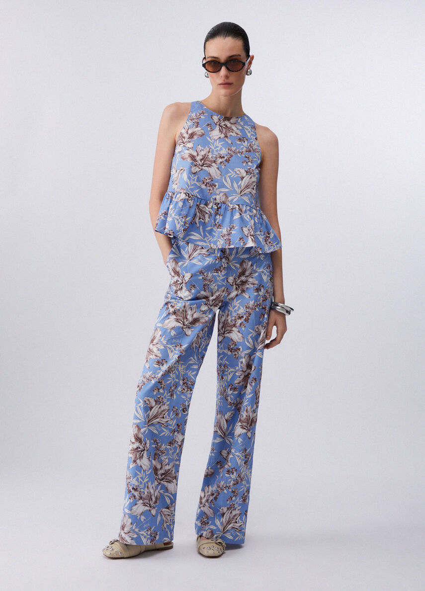 La base azzurro polvere di questi pantaloni illumina con eleganza primaverile, mentre la stampa floreale dai toni naturali e leggermente smoky dona al popeline un twist fresco e contemporaneo. Sceglilo in coordinato con il top per un look d'impatto.