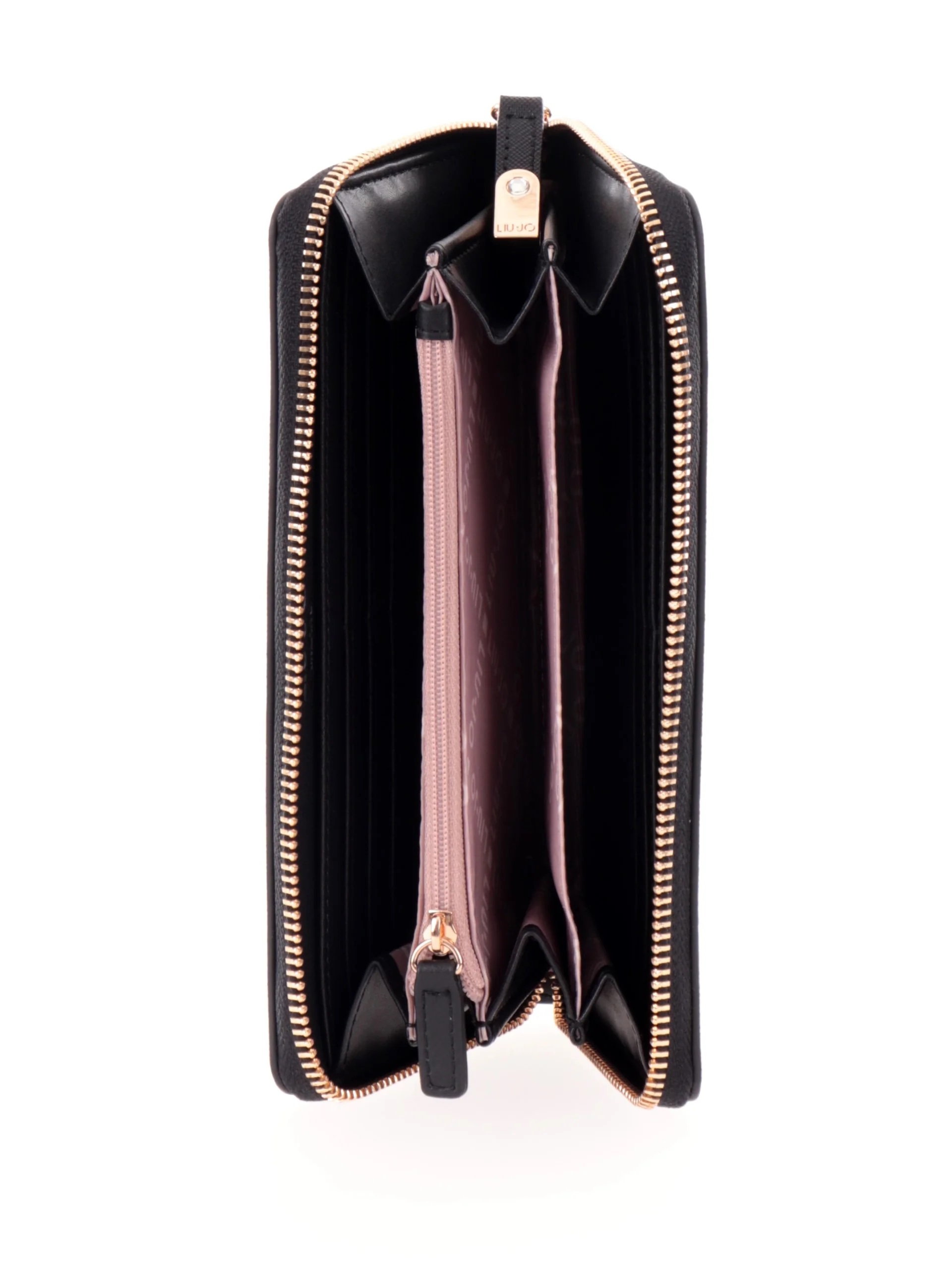 Portafoglio Zip Around grande Liu Jo, spazioso e funzionale accessorio in similpelle, con logo frontale embossed. Comparto con chiusura con cerniera e interno organizzato con spezioni separate per banconote e documenti, slot per carte di credito e taschino centrale con zip per le monete.