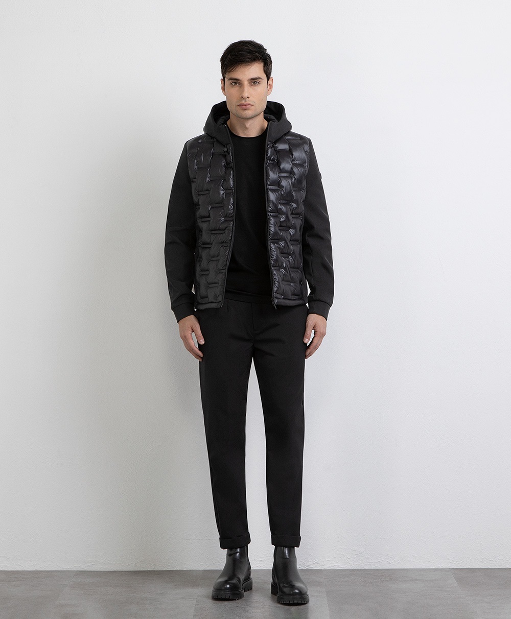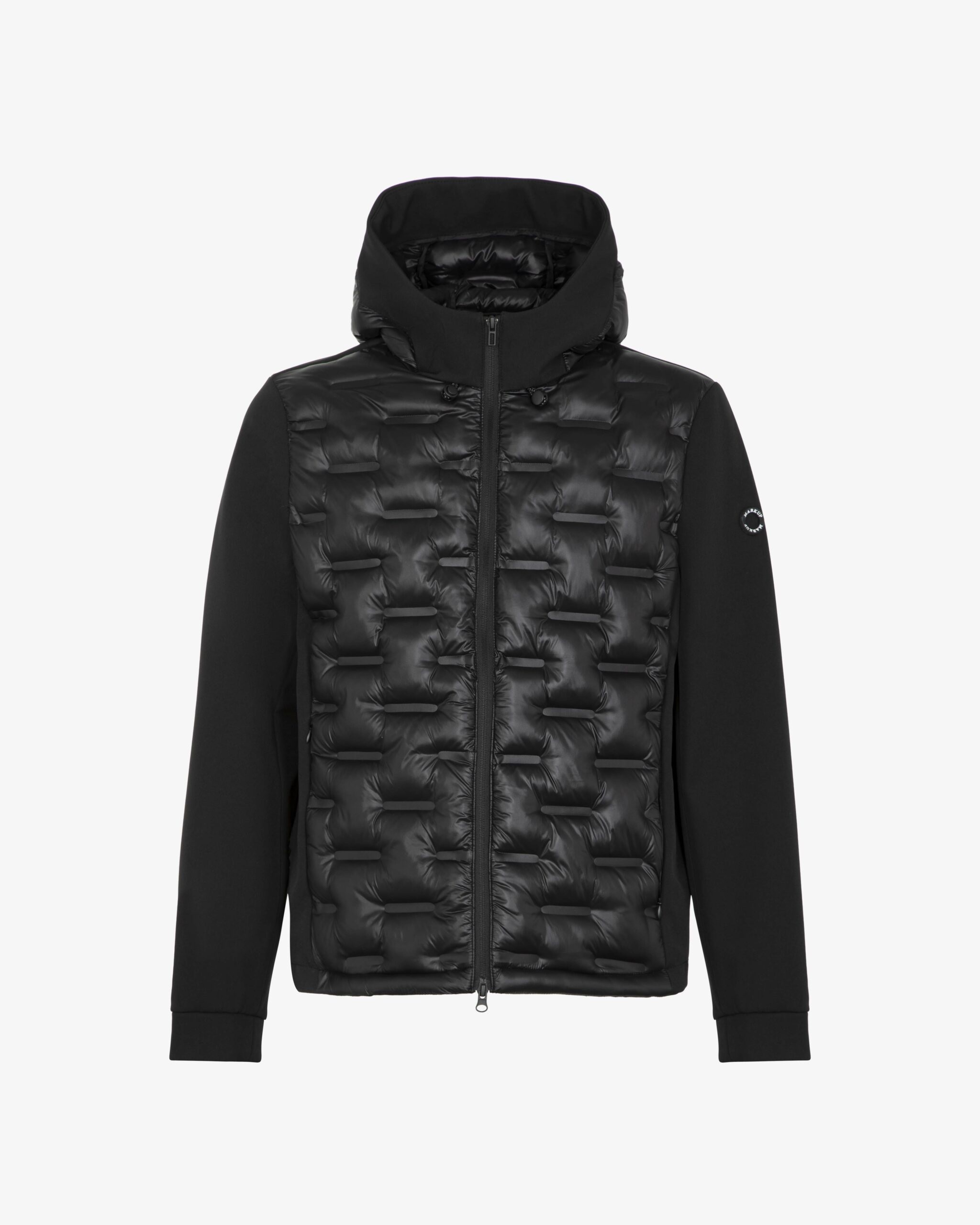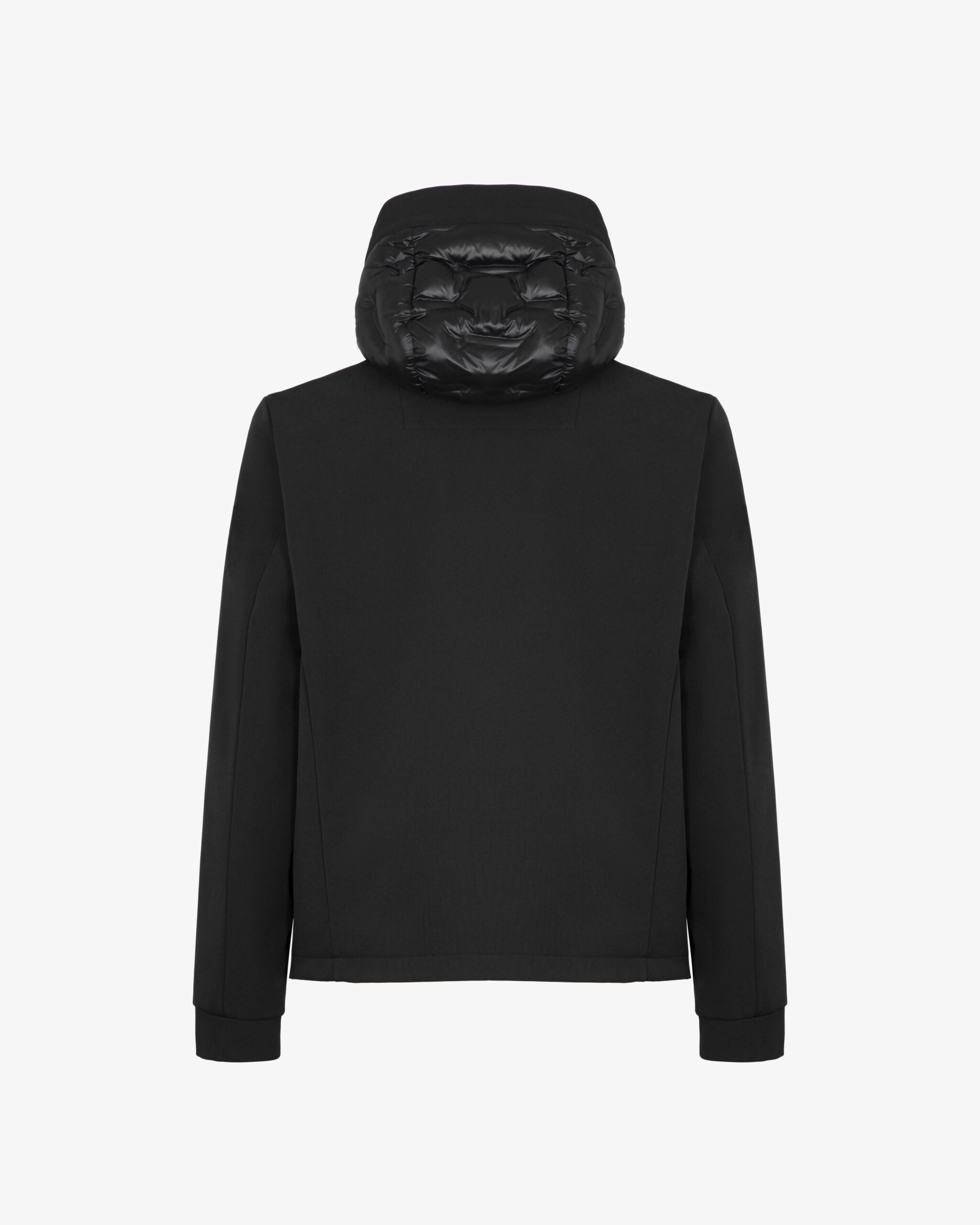 Giubbino con cappuccio. Modello combinato Softshell/Nylon. Imbottitura medio peso. Interni con dettagli di stampa.