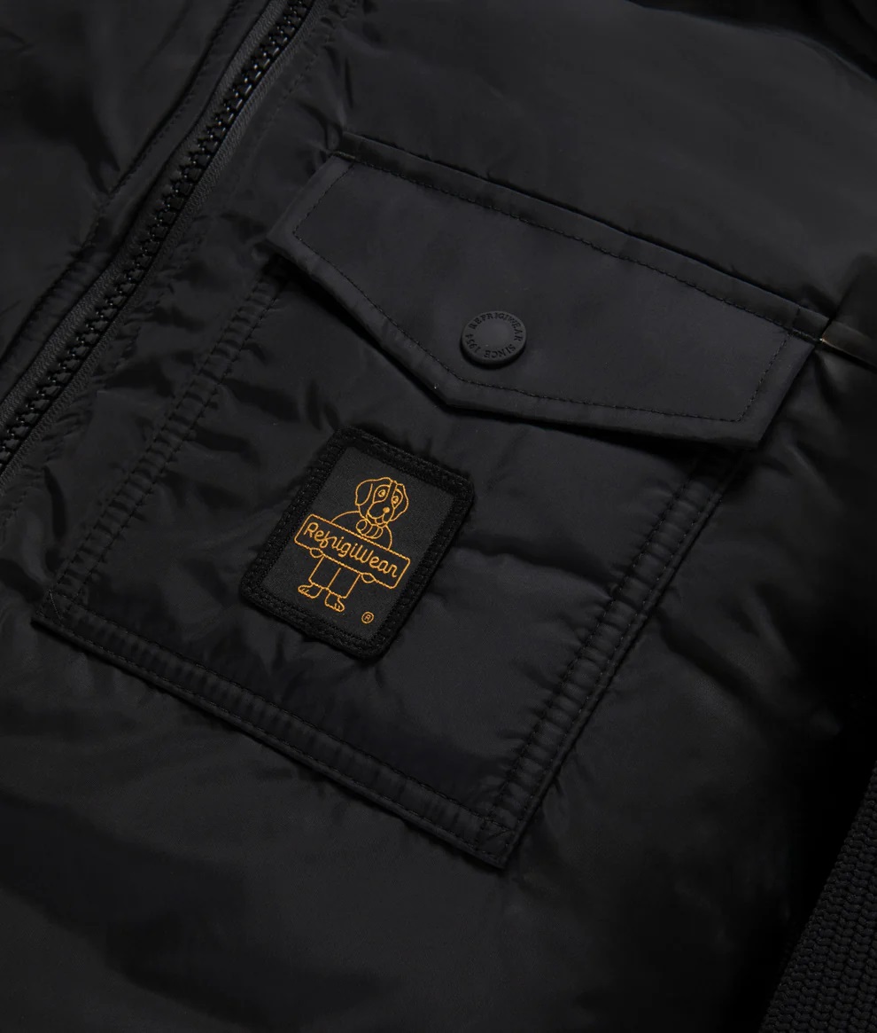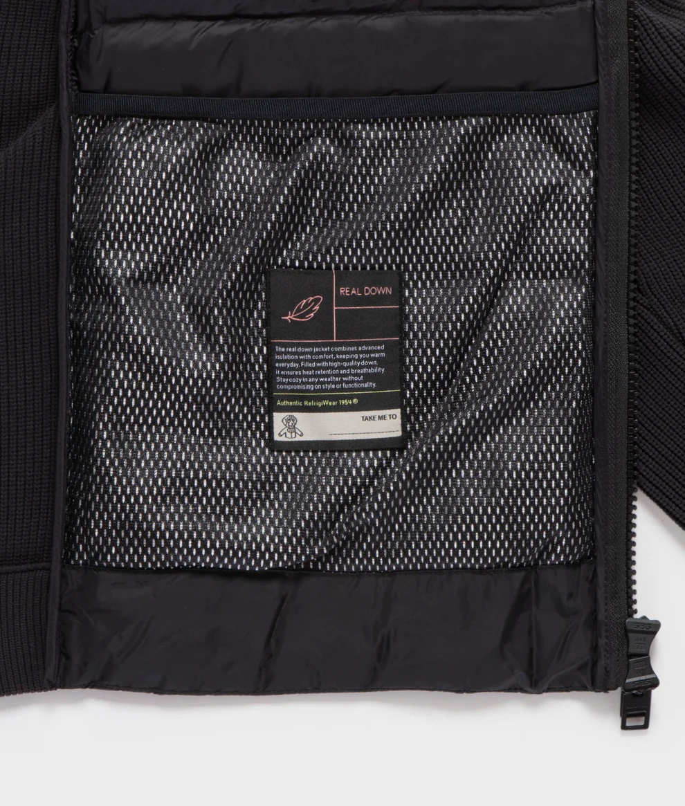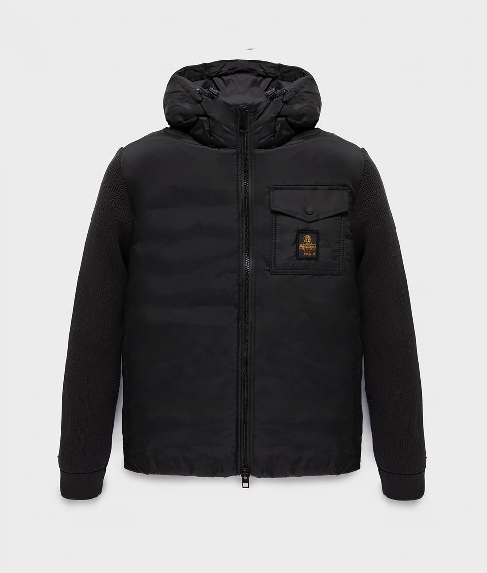 Piumino invernale ibrido dal design sofisticato e contemporaneo. Il corpo frontale e il cappuccio sono in nylon opaco, dalla finitura morbida e vellutata al tatto, imbottito in 100% piuma 90/10 certificata RDS e dotato di membrana Reclosed®, che limita la fuoriuscita di piume e garantisce prestazioni durature. Retro e maniche sono in maglia tecnica ad alte prestazioni, lavorata con filo di nylon super-tech ritorto per fornire compattezza, resistenza e comfort. Water Resistant e Wind Resistant, completato da iconico taschino con patch logo RefrigiWear®.