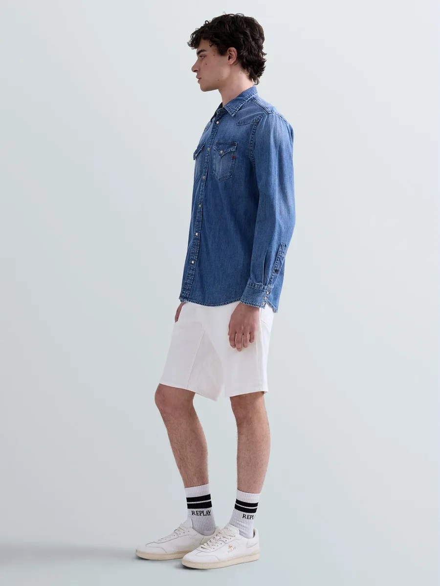Camicia d'ispirazione western realizzata in leggero deep blue indigo denim di cotone 6,5 oz in tono di lavaggio medio-scuro con trattamento enzimatico eco stone wash con pietra pomice sintetica e graffiatura eseguita a mano per creare forti contrasti sulle zone d'usura. Il modello a maniche lunghe presenta un'abbottonatura frontale, due tasche applicate con patta a punta e bottone sul petto epolsini con bottoni. Rifiniscono il design il ricamo R su una delle tasche frontali e il particolare carré sul davanti e sul retro.
