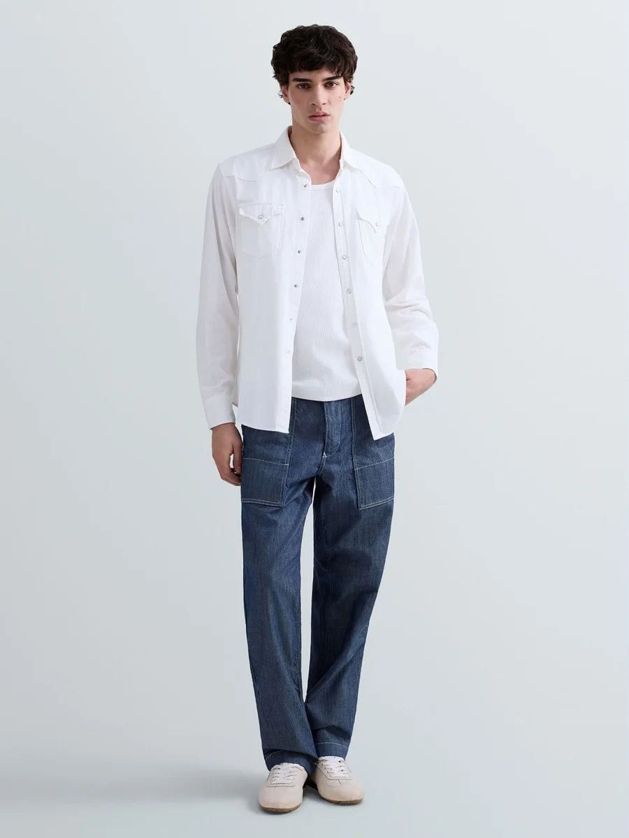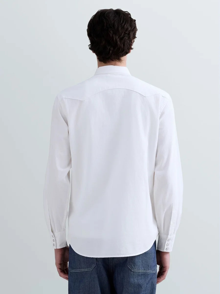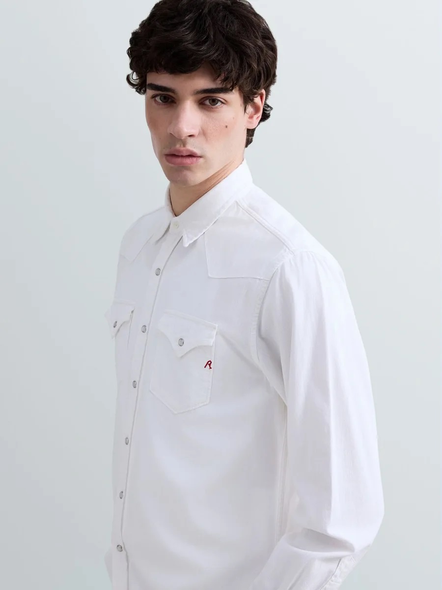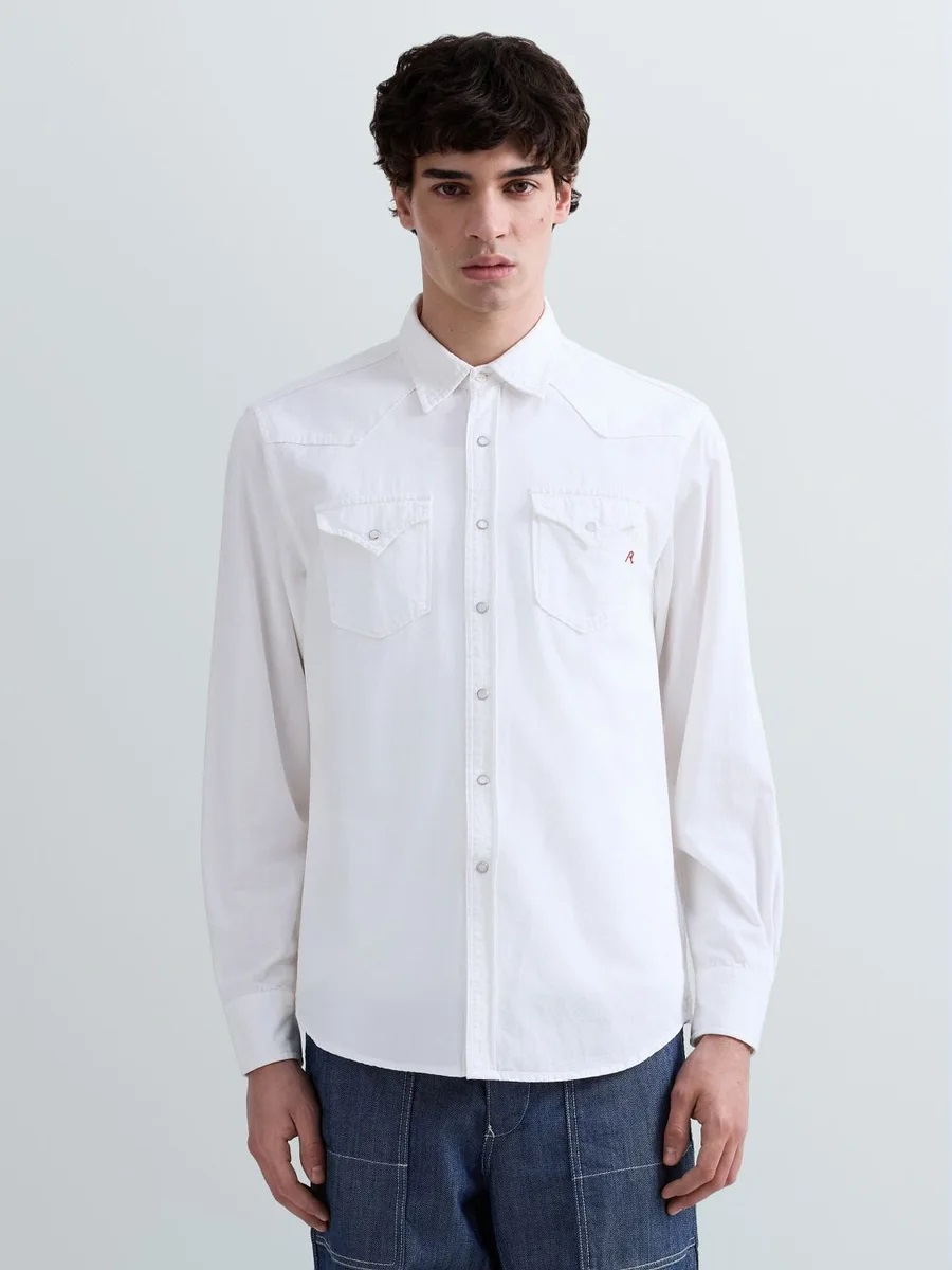 Camicia dalla vestibilità regolare realizzata in leggero denim bianco di puro cotone riciclato 5 oz. Il modello a maniche lunghe presenta un orlo stondato, due tasche frontali con patta a punta d'ispirazione western e bottone, e una pratica chiusura con bottoni apressione, ripresi anche sulle tasche e sui polsini. Rifiniscono il design il carré fronte e retro, anch'esso in stile western, e il dettaglio R ricamato in rosso sulla patta di una delle tasche.