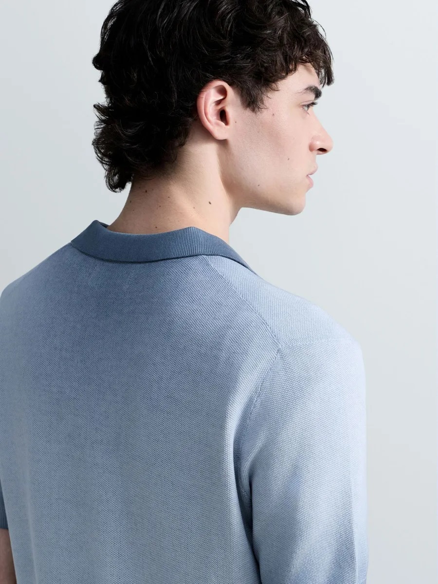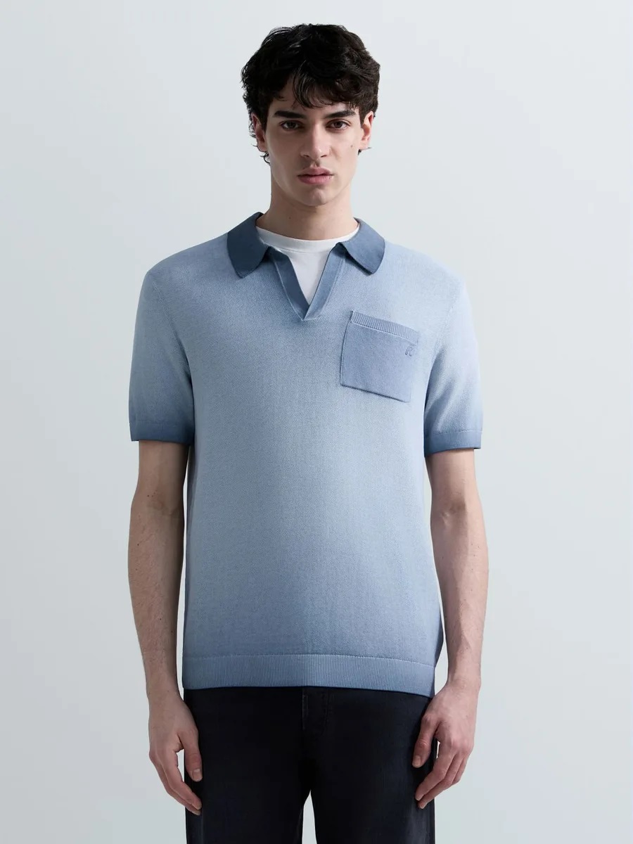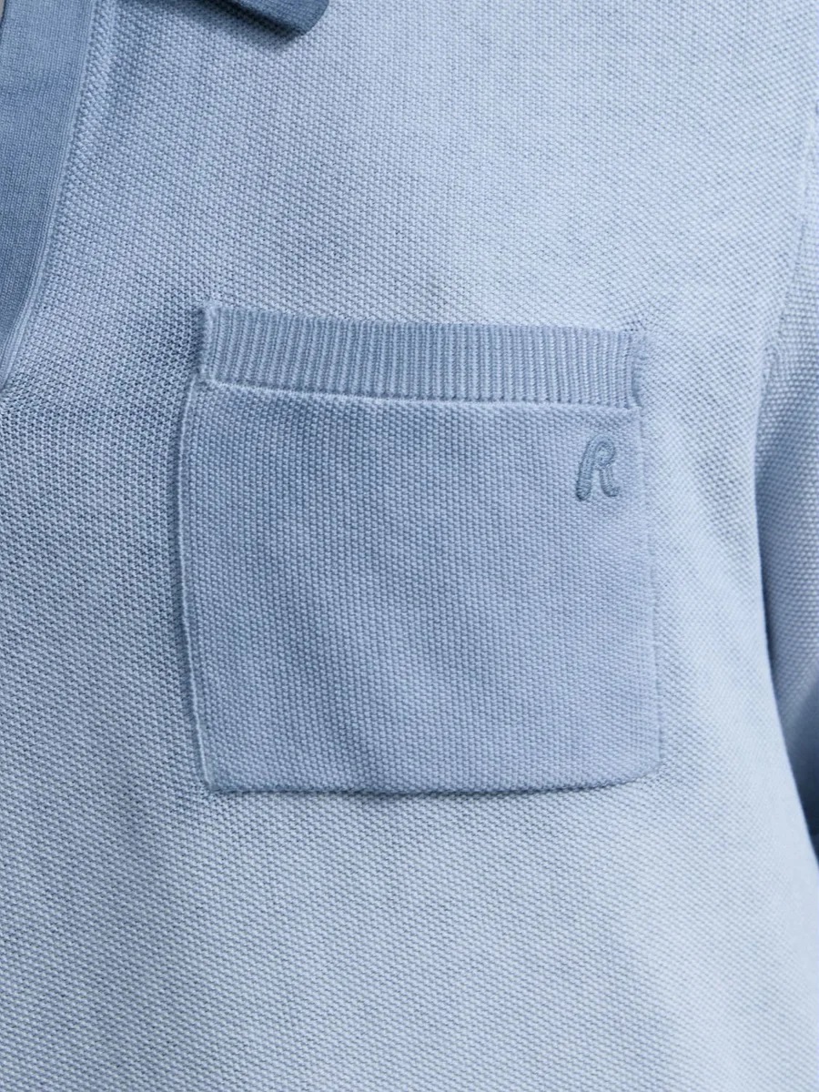 Polo dalla vestibilità regolare realizzata in morbida maglia di cotone dal particolare effetto sfumato in corrispondenza di collo, taschino, fondo manica e fondo capo. Il modello a maniche corte presenta un colletto a contrasto con piccola apertura a V e un taschino sul petto, ed è rifinito dal bordo superiore della tasca, fondo manica e fondo capo lavorati a costine. Completa il design l'iconico dettaglio R ricamato in tono sul taschino del petto.
