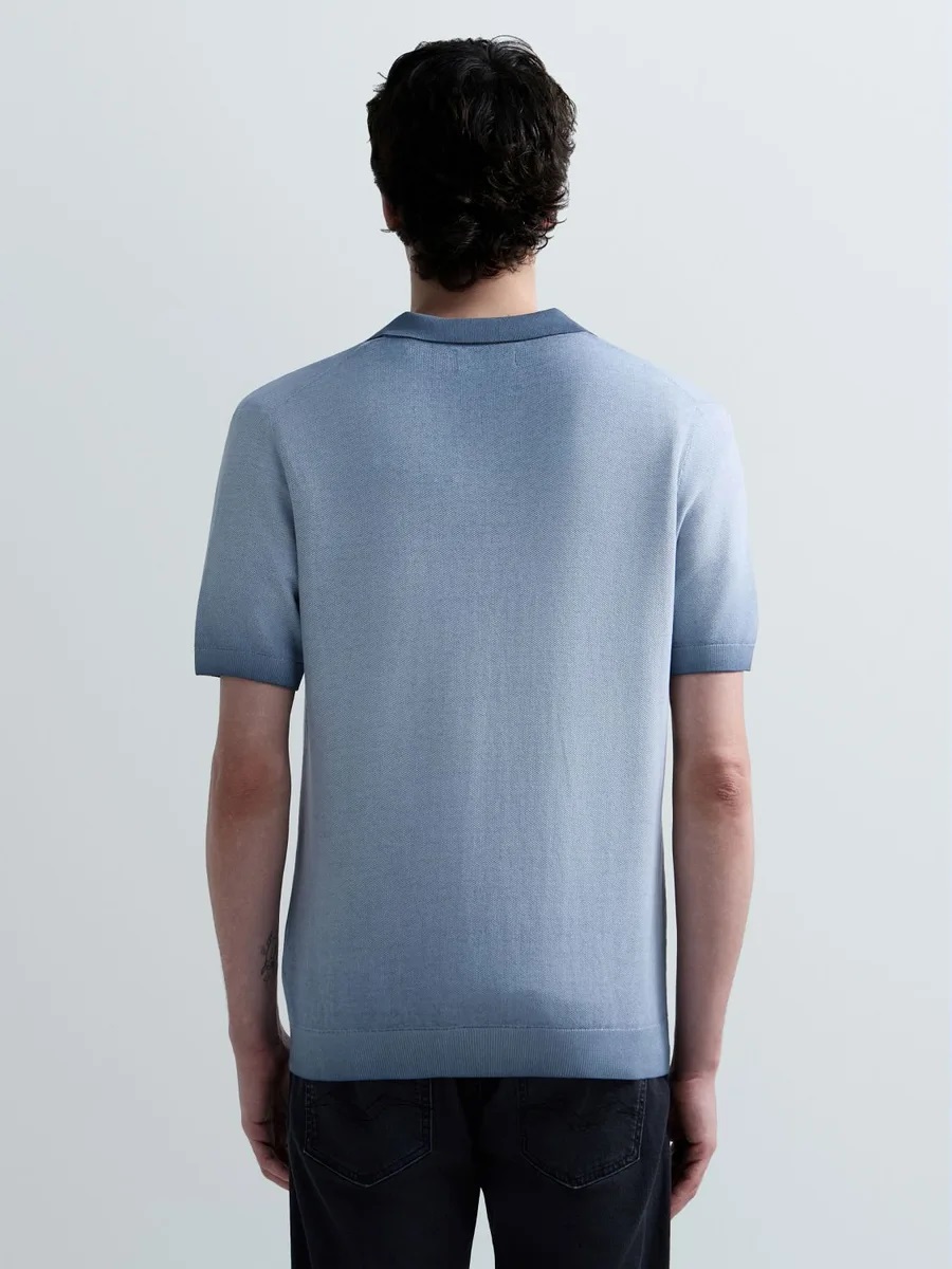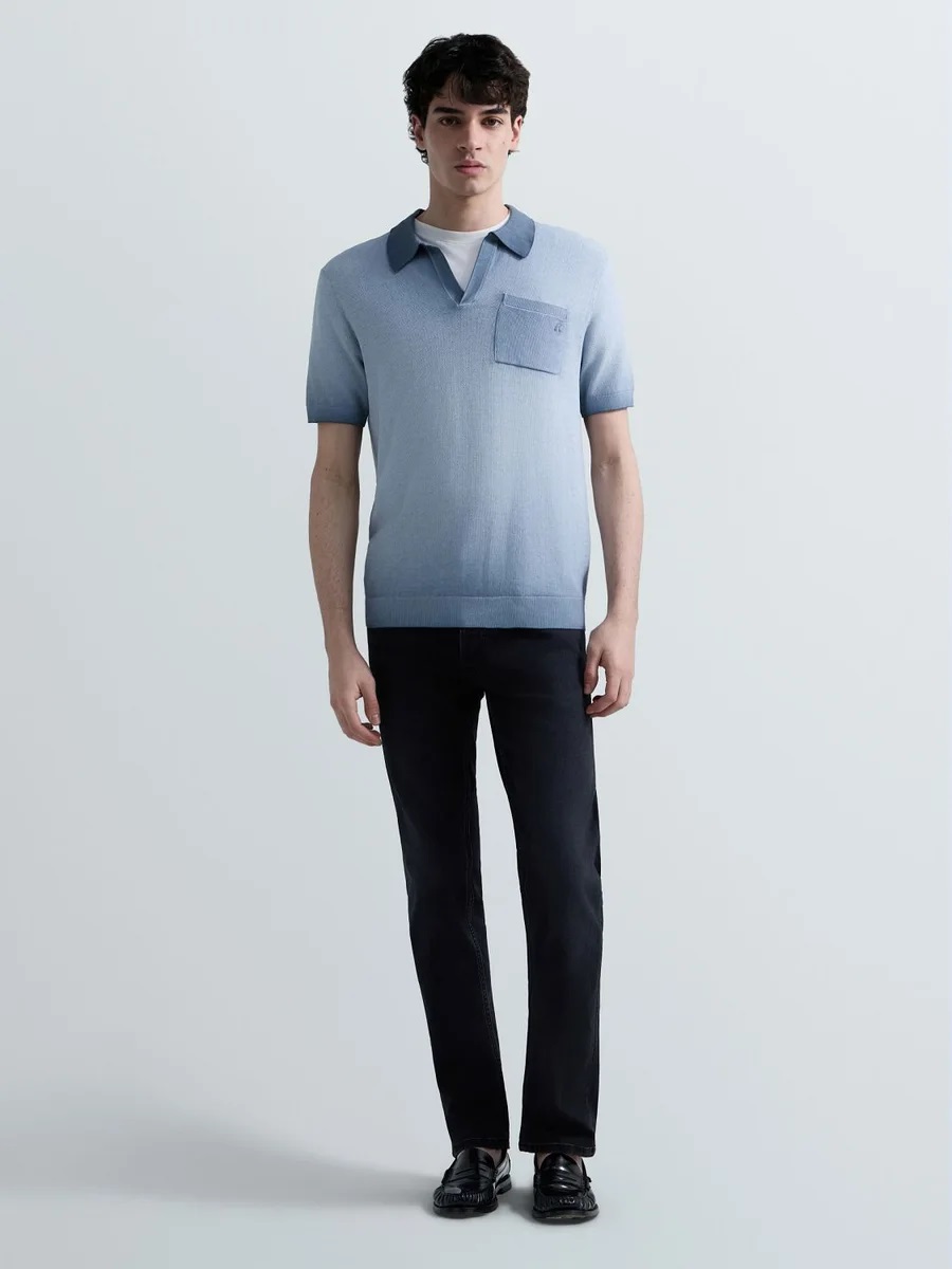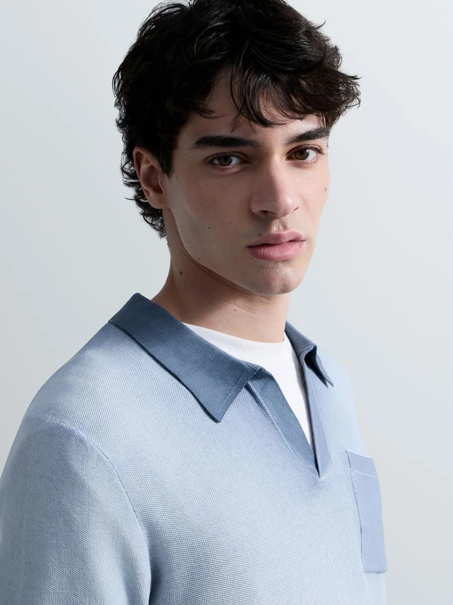 Polo dalla vestibilità regolare realizzata in morbida maglia di cotone dal particolare effetto sfumato in corrispondenza di collo, taschino, fondo manica e fondo capo. Il modello a maniche corte presenta un colletto a contrasto con piccola apertura a V e un taschino sul petto, ed è rifinito dal bordo superiore della tasca, fondo manica e fondo capo lavorati a costine. Completa il design l'iconico dettaglio R ricamato in tono sul taschino del petto.