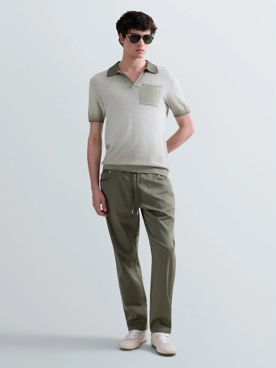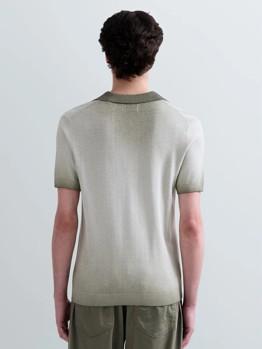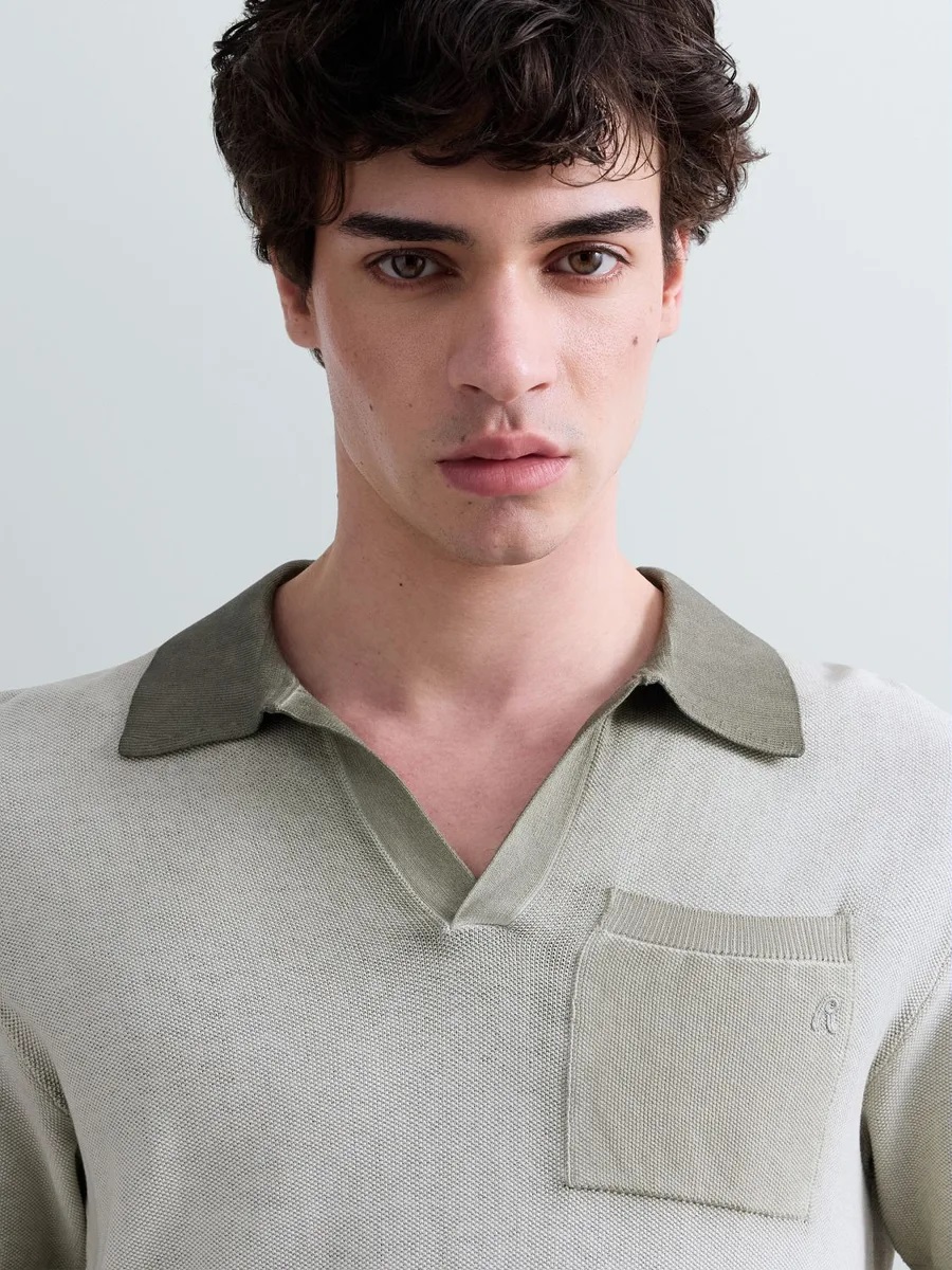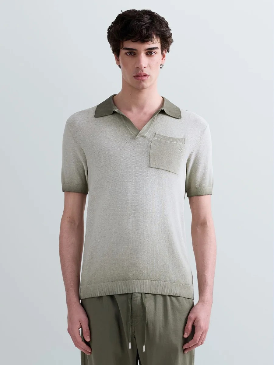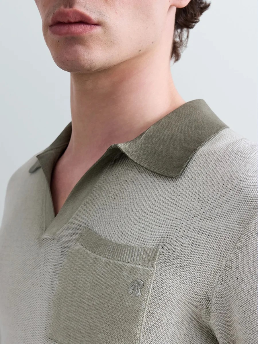 Polo dalla vestibilità regolare realizzata in morbida maglia di cotone dal particolare effetto sfumato in corrispondenza di collo, taschino, fondo manica e fondo capo. Il modello a maniche corte presenta un colletto a contrasto con piccola apertura a V e un taschino sul petto, ed è rifinito dal bordo superiore della tasca, fondo manica e fondo capo lavorati a costine. Completa il design l'iconico dettaglio R ricamato in tono sul taschino del petto.