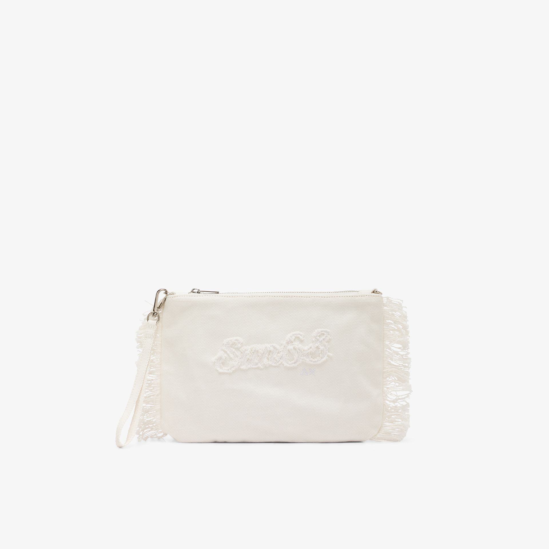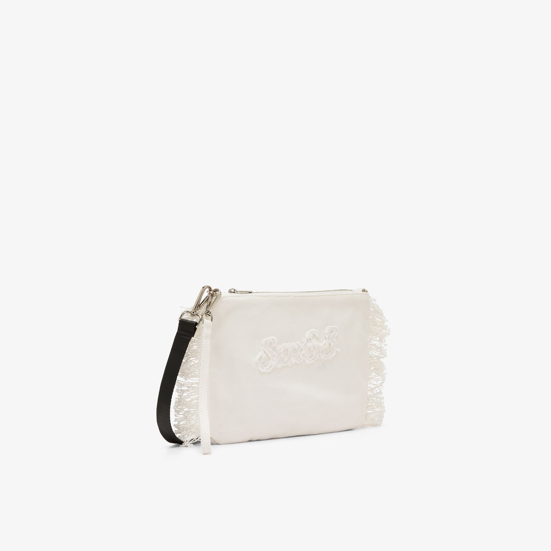 Pochette in tela di cotone Frange sui lati Manico da polso rimovibile Tracolla in gros grain rimovibile Tasca interna con zip Chiusura con zip Patch SUN68 ricamata sul davanti