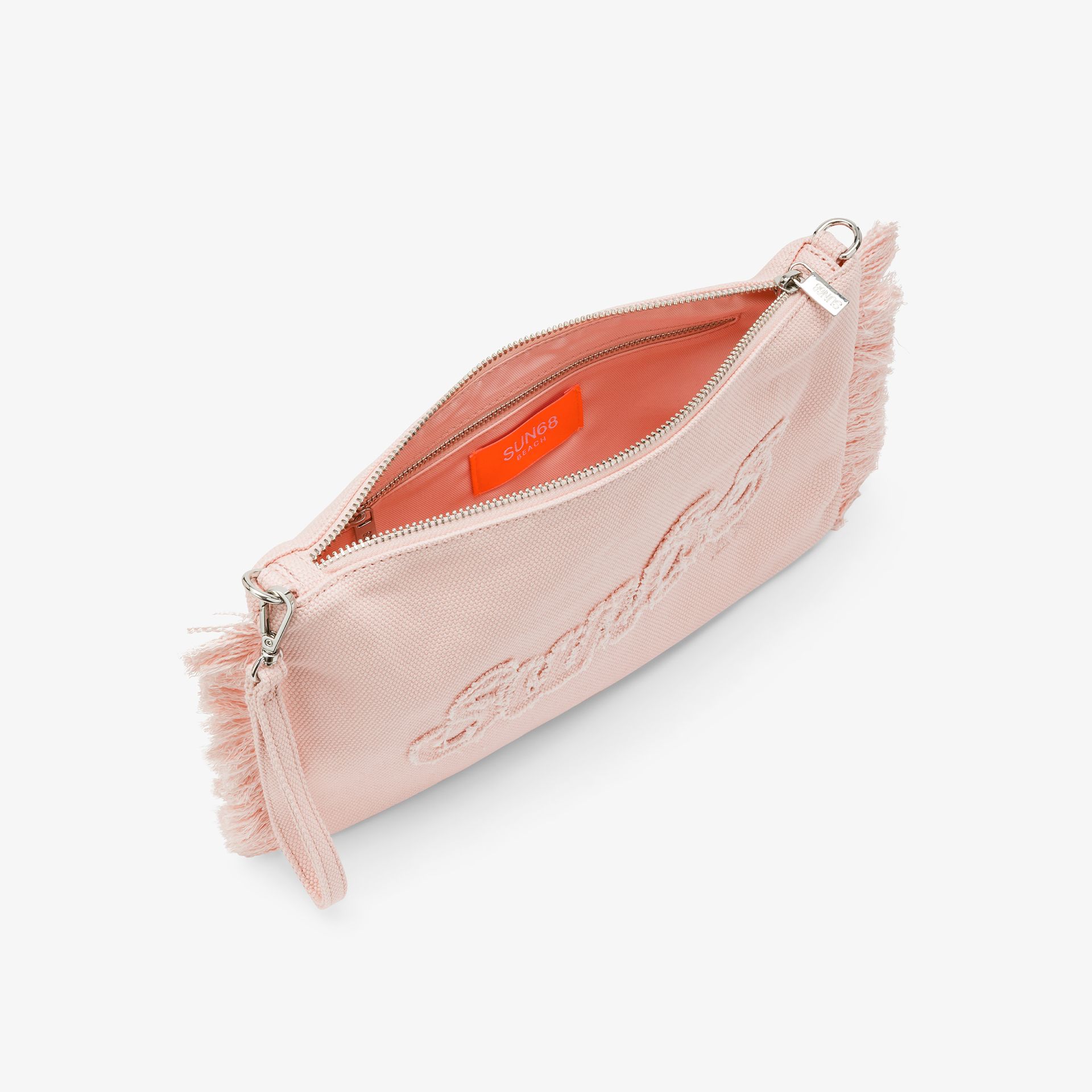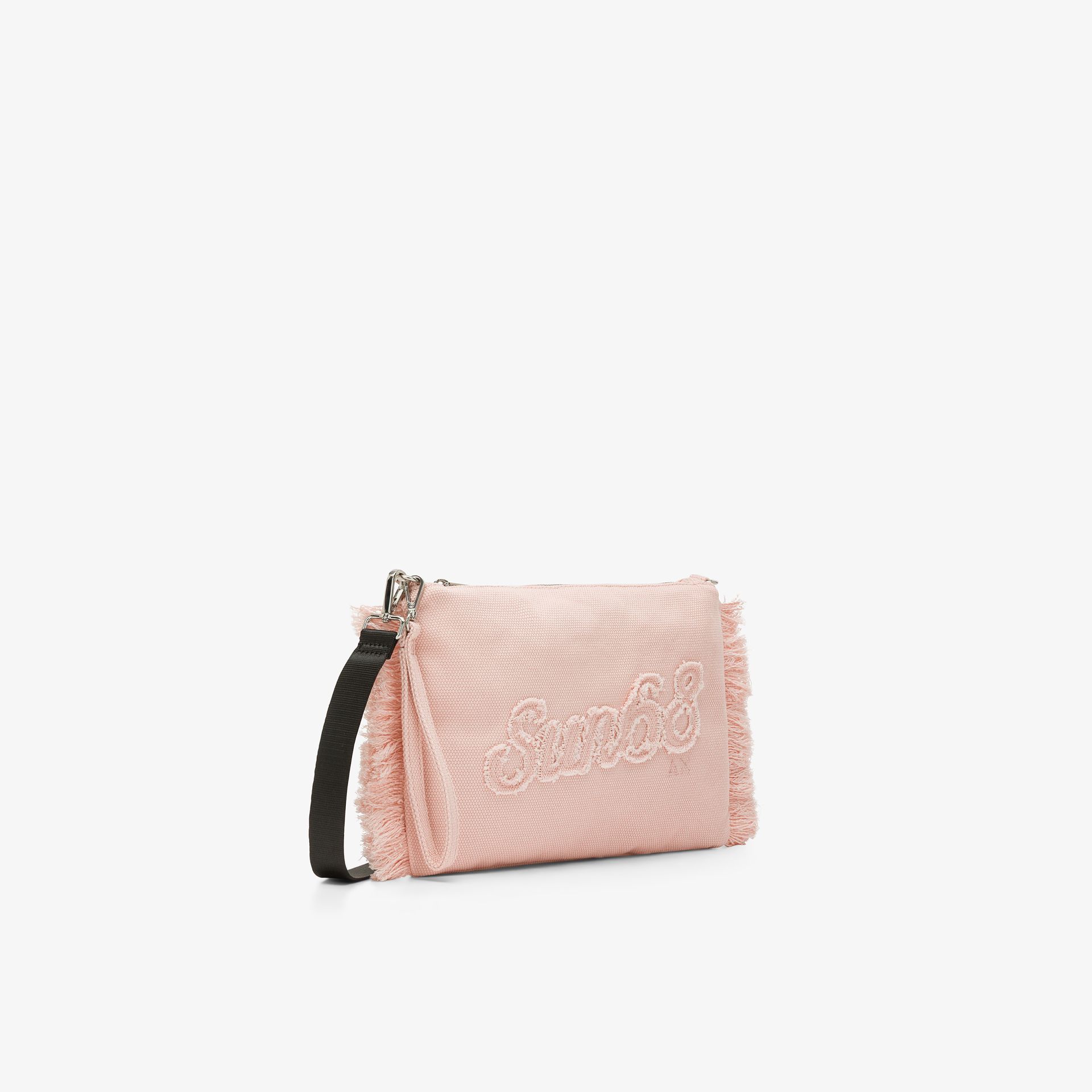 Pochette in tela di cotone Frange sui lati Manico da polso rimovibile Tracolla in gros grain rimovibile Tasca interna con zip Chiusura con zip Patch SUN68 ricamata sul davanti