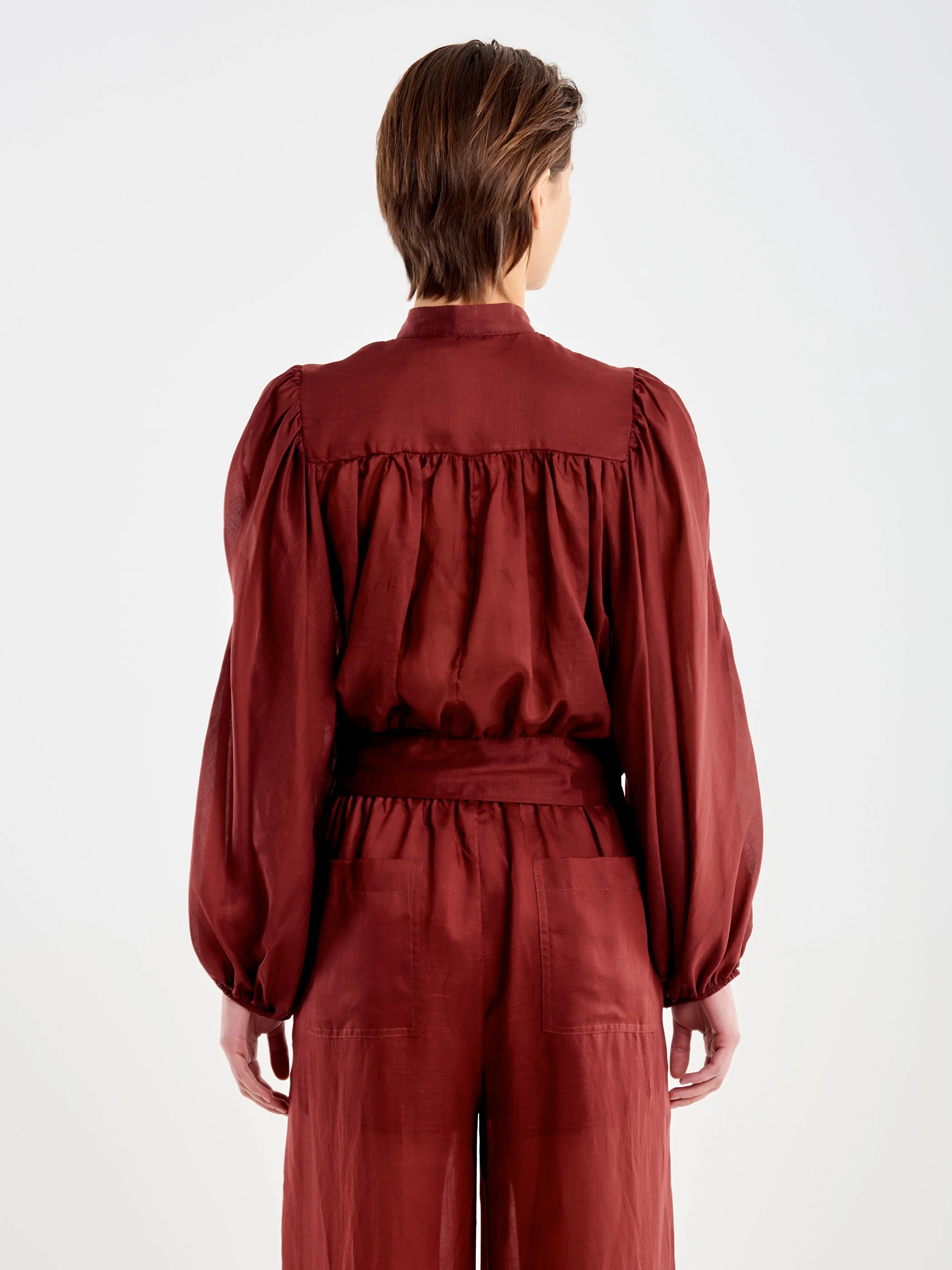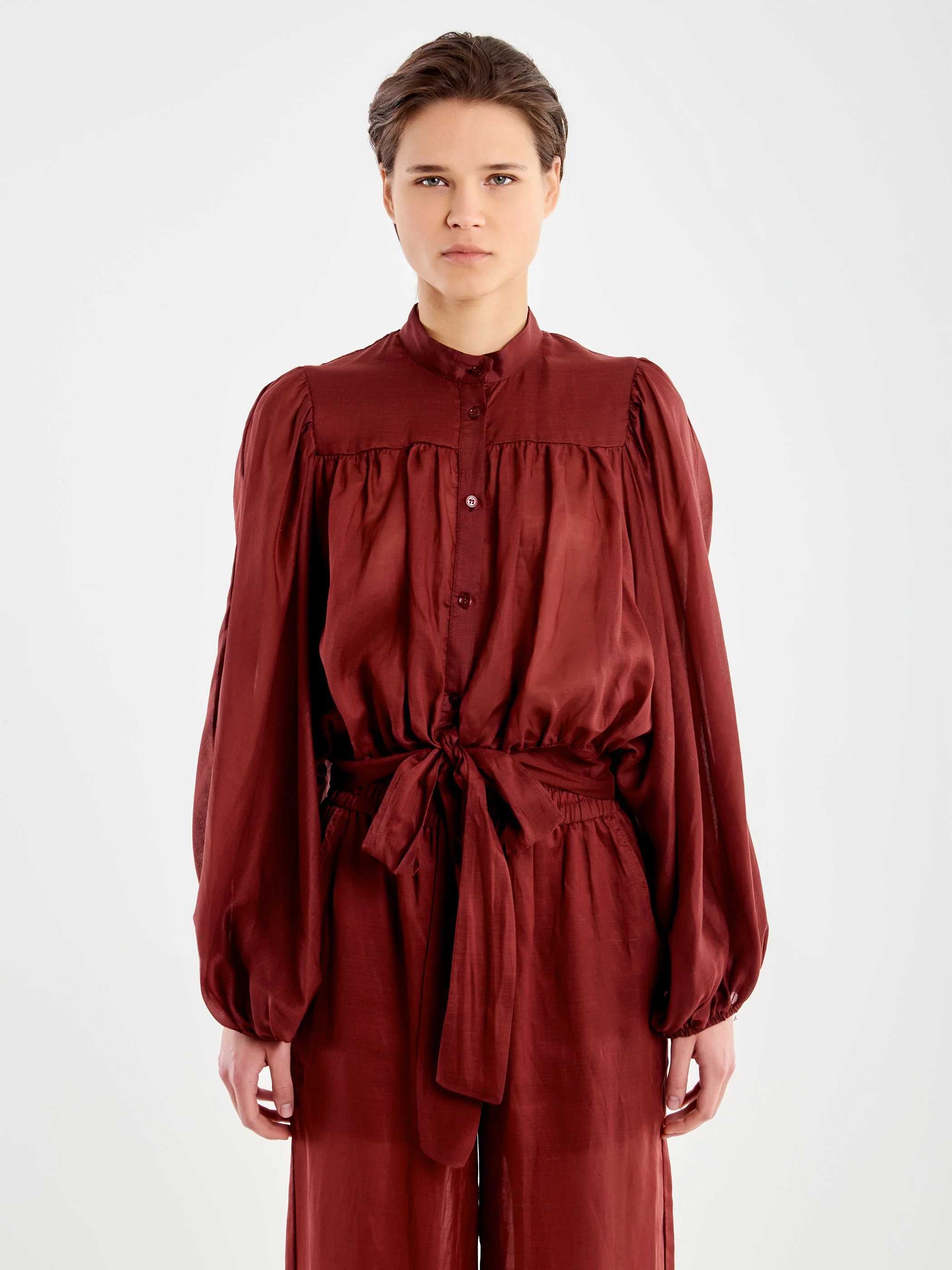 Camicia in voile con fiocco sul fondo. Maniche lunghe con elastico sul fondo. Chiusura frontale con bottoncini. Collo alla coreana.