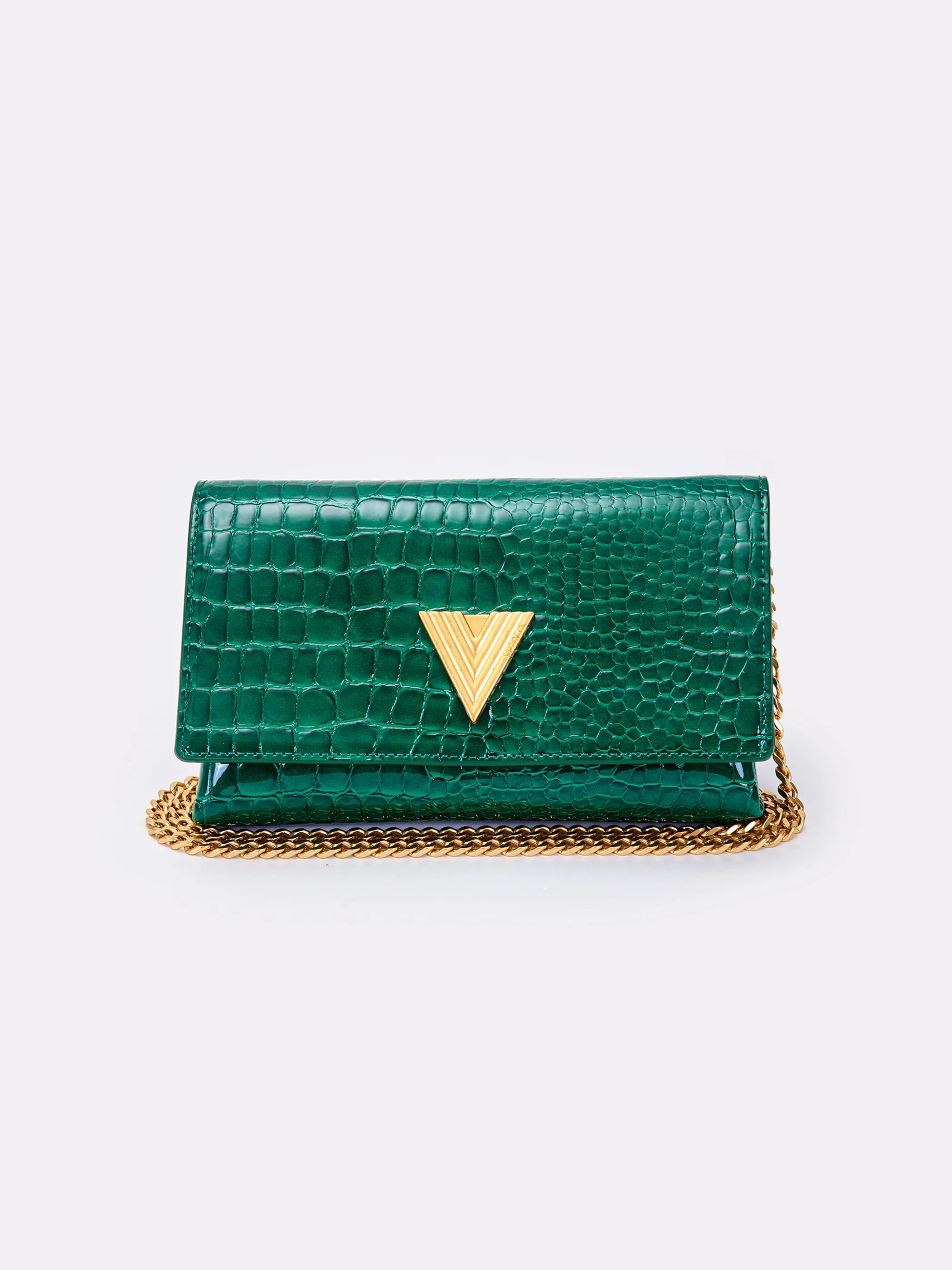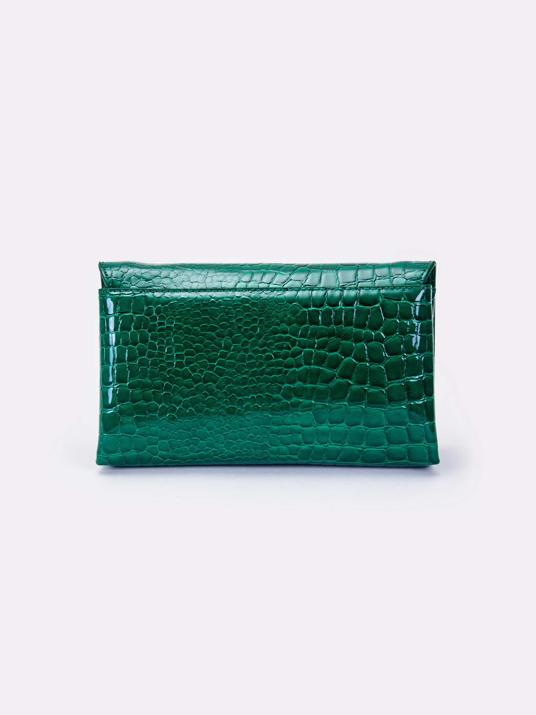 Borsa Shibuya a tracolla in ecopelle effetto "coco" in vernice. Chiusura a pattina con bottone a pressione con calamita. Dettaglio fibbia V metal plate Vicolo. Tracolla con catena removibile. La borsa può essere indossata come borsa a spalla, a tracolla e come borsa a mano. Dettaglio finiture anticate color oro. Tasca interna con cerniera e taschina piatta, doppio scomparto interno in tessuto.