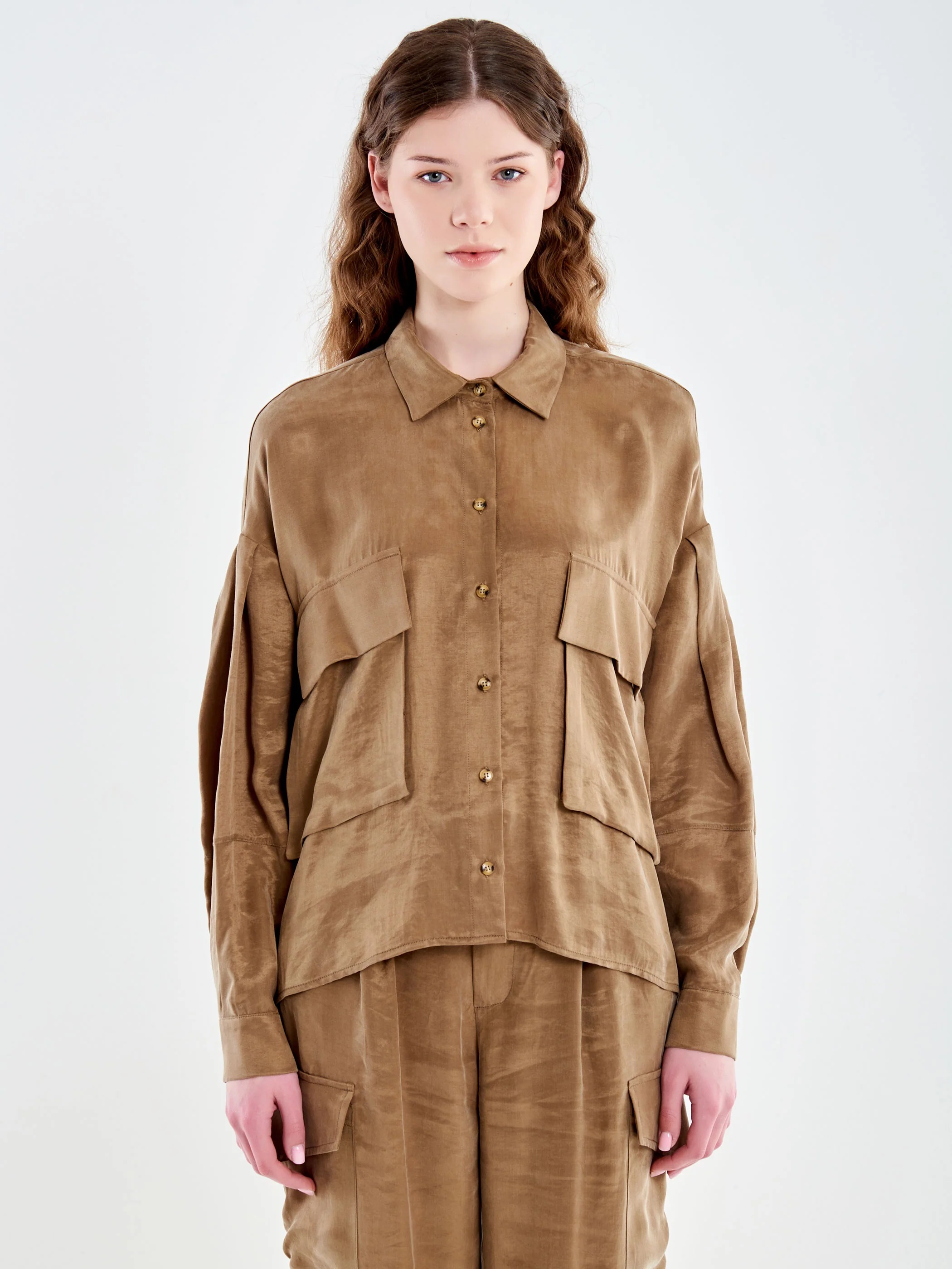 Camicia cropped con tascone frontali. Con colletto e chiusura a bottoncini.