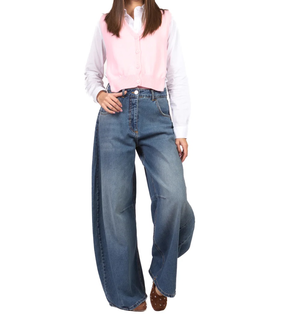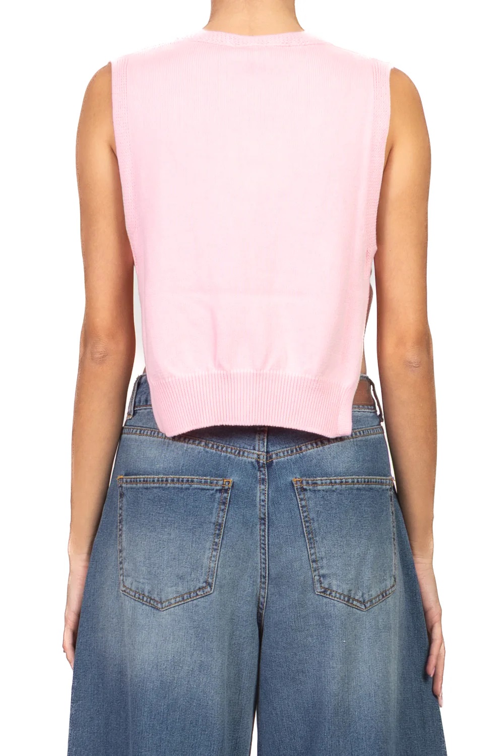 Gilet in maglia scollo a v con fianchi aperti. Chiusura frontale con bottoncini. Finiture in maglia a costina.