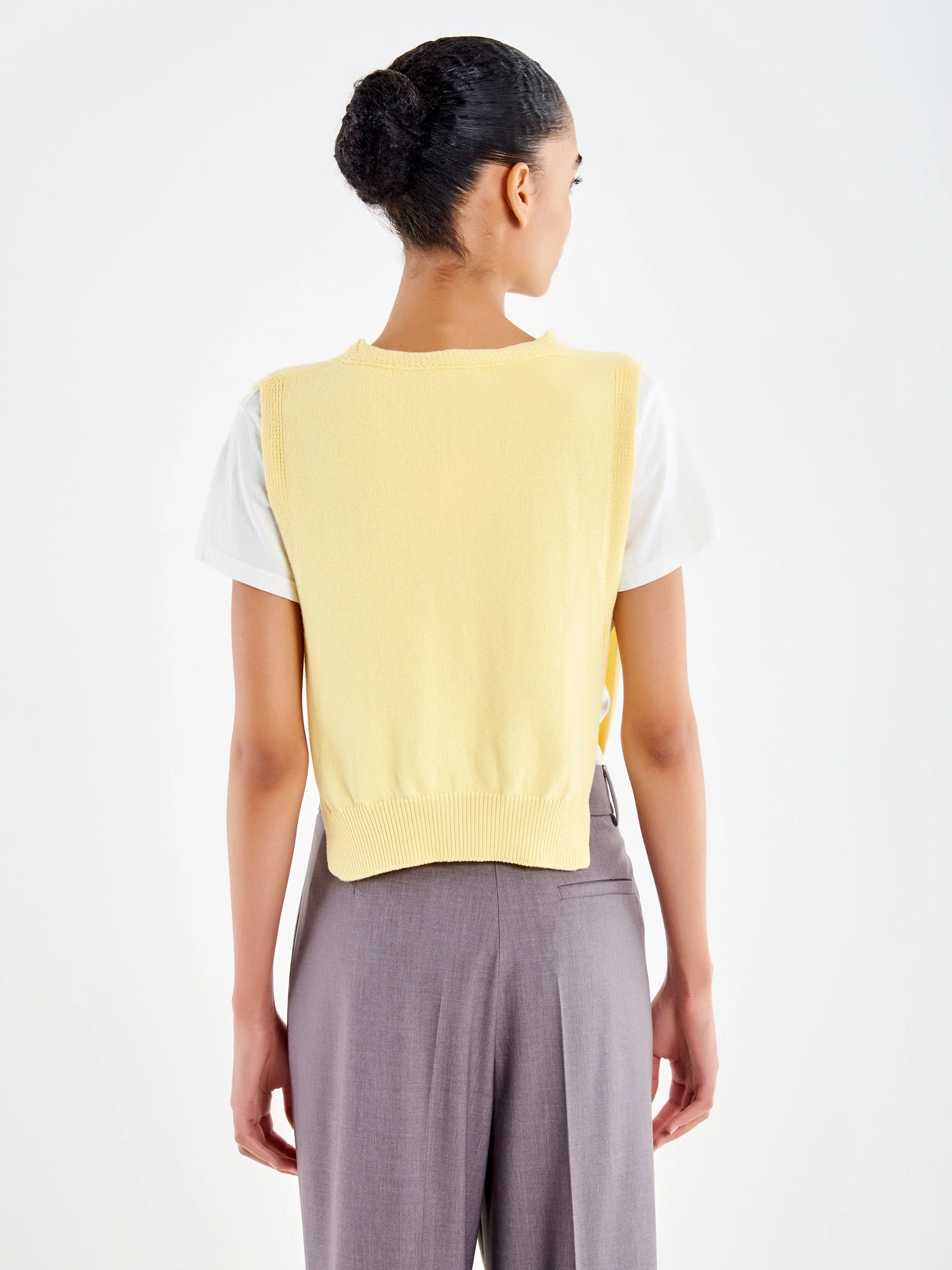 Gilet in maglia scollo a v con fianchi aperti. Chiusura frontale con bottoncini. Finiture in maglia a costina.