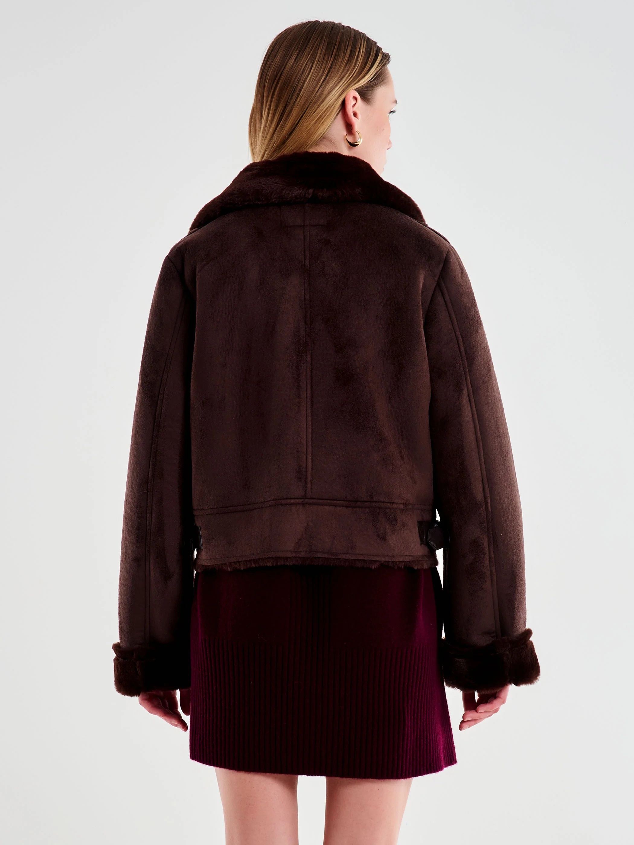 Giubbotto biker cropped con esterno effetto scamosciato ed interno in ecopelliccia. Maniche lunghe con polsino con risvolto. Collo a revers. Chiusura con zip leggermente laterale. Tasche frontali con zip.