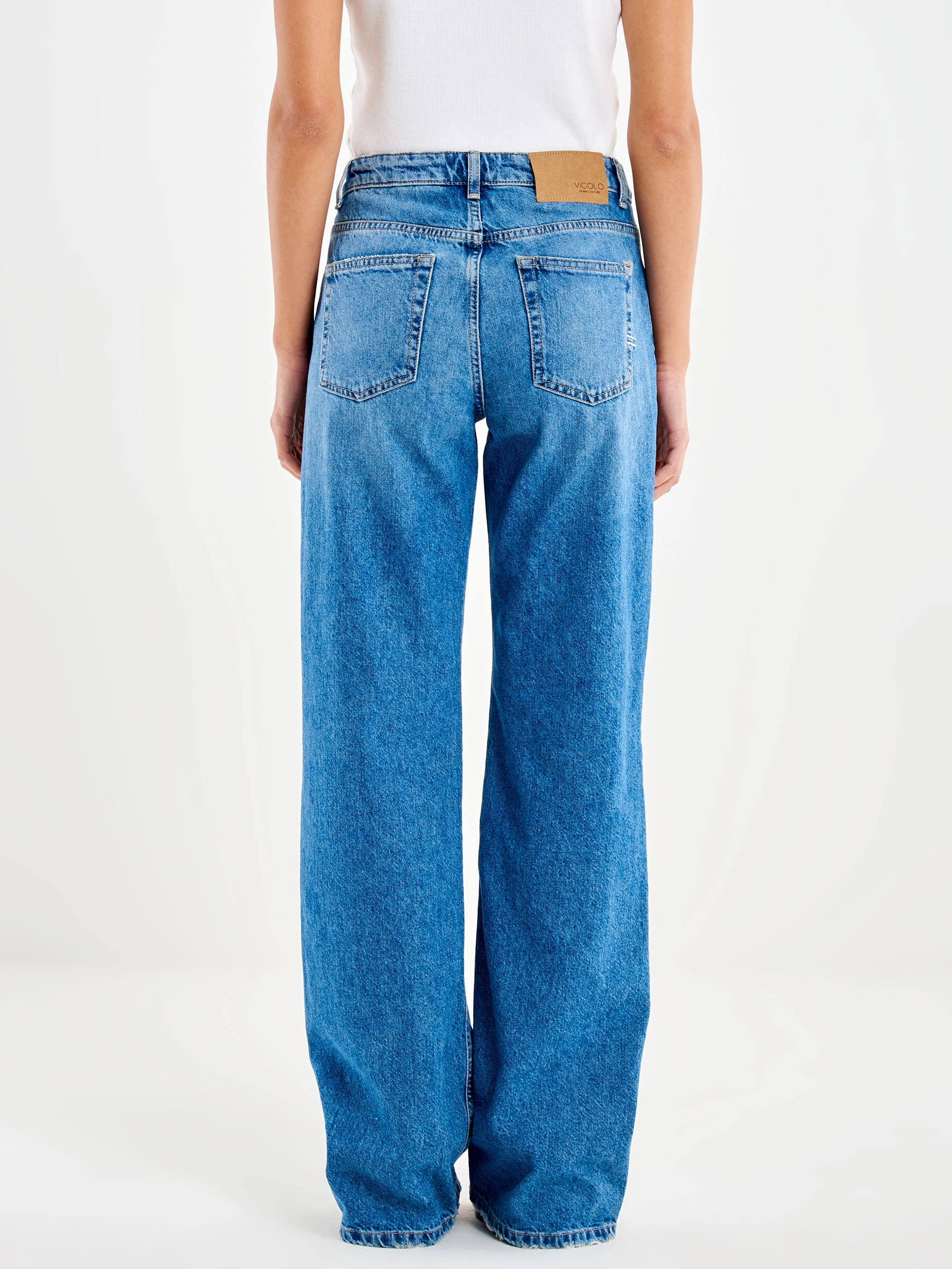 Jeans a vita regolare. Modello cinque tasche. Relaxed Fit, gamba lunga. Chiusura con zip e bottone in metallo. Denim blu.