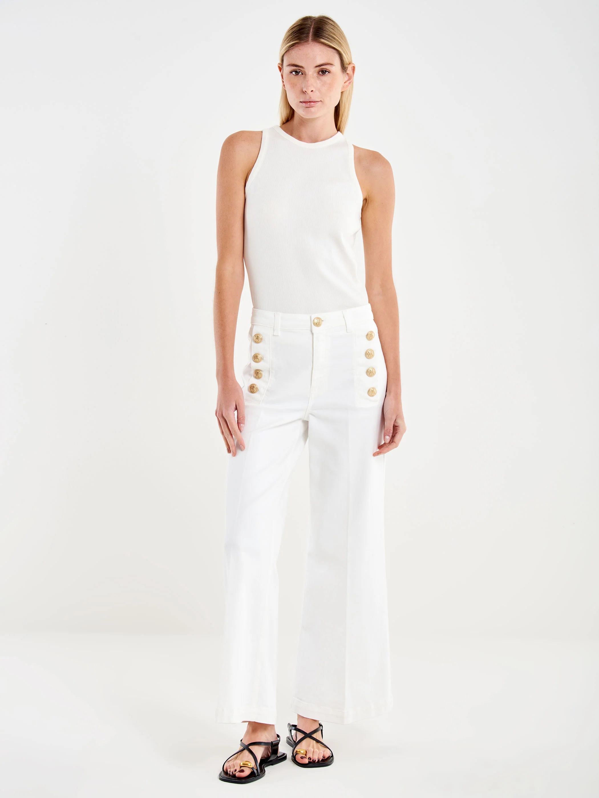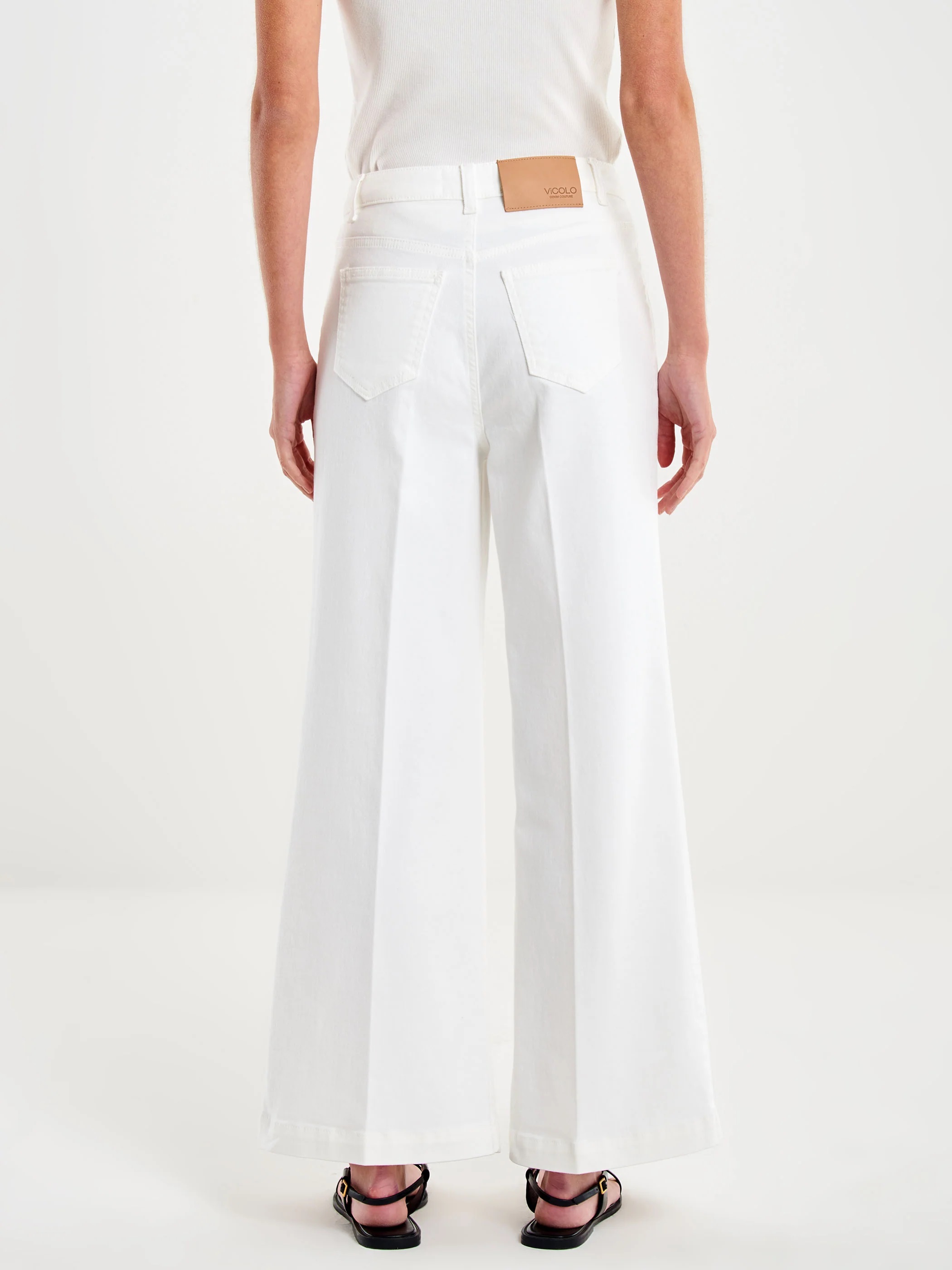 Jeans vita media, wide leg. Chiusura frontale con zip e bottone in metallo. Dettaglio bottoni araldici oro sulle tasche e piega centrale frontale e posteriore sulla gamba.