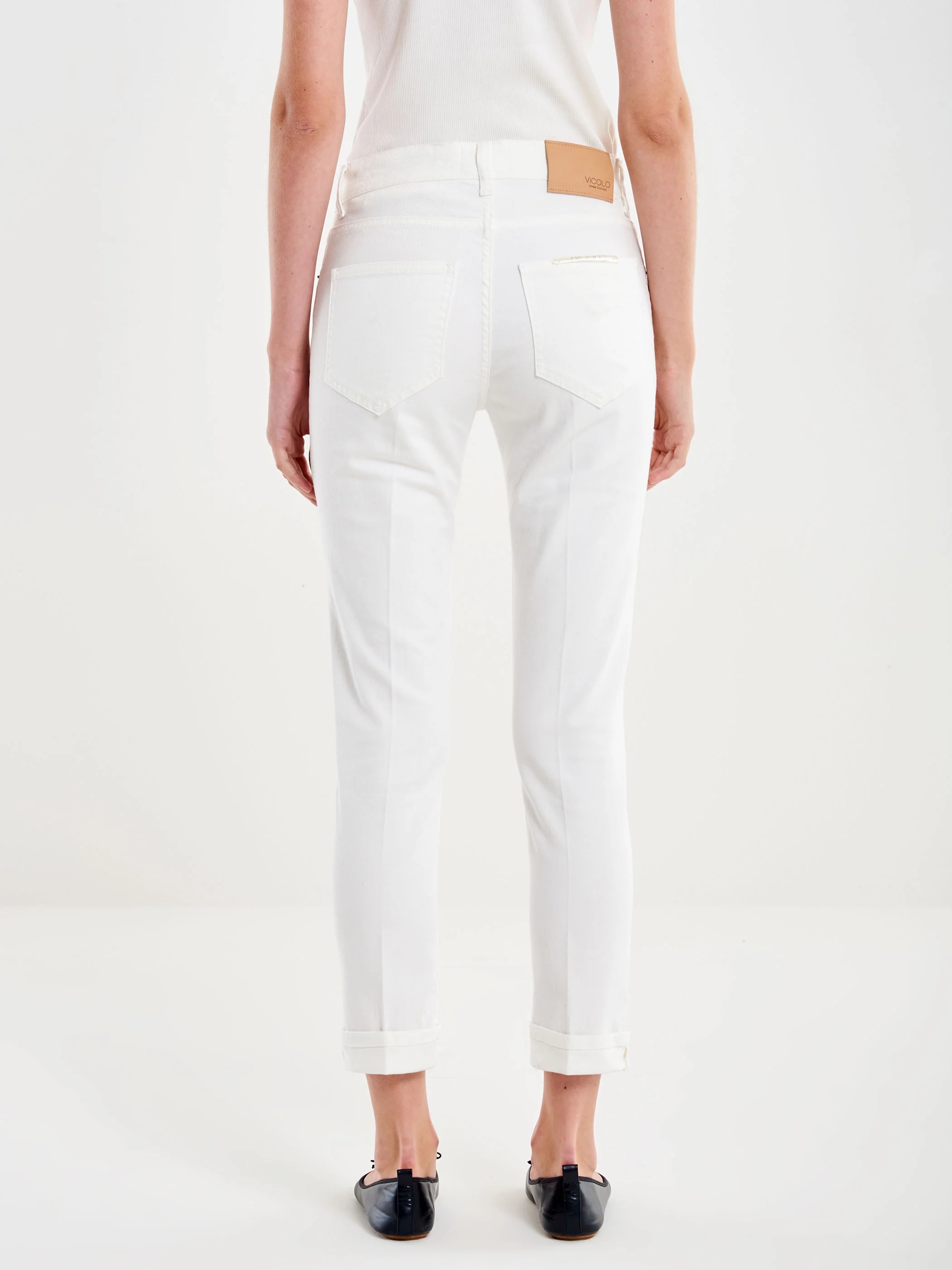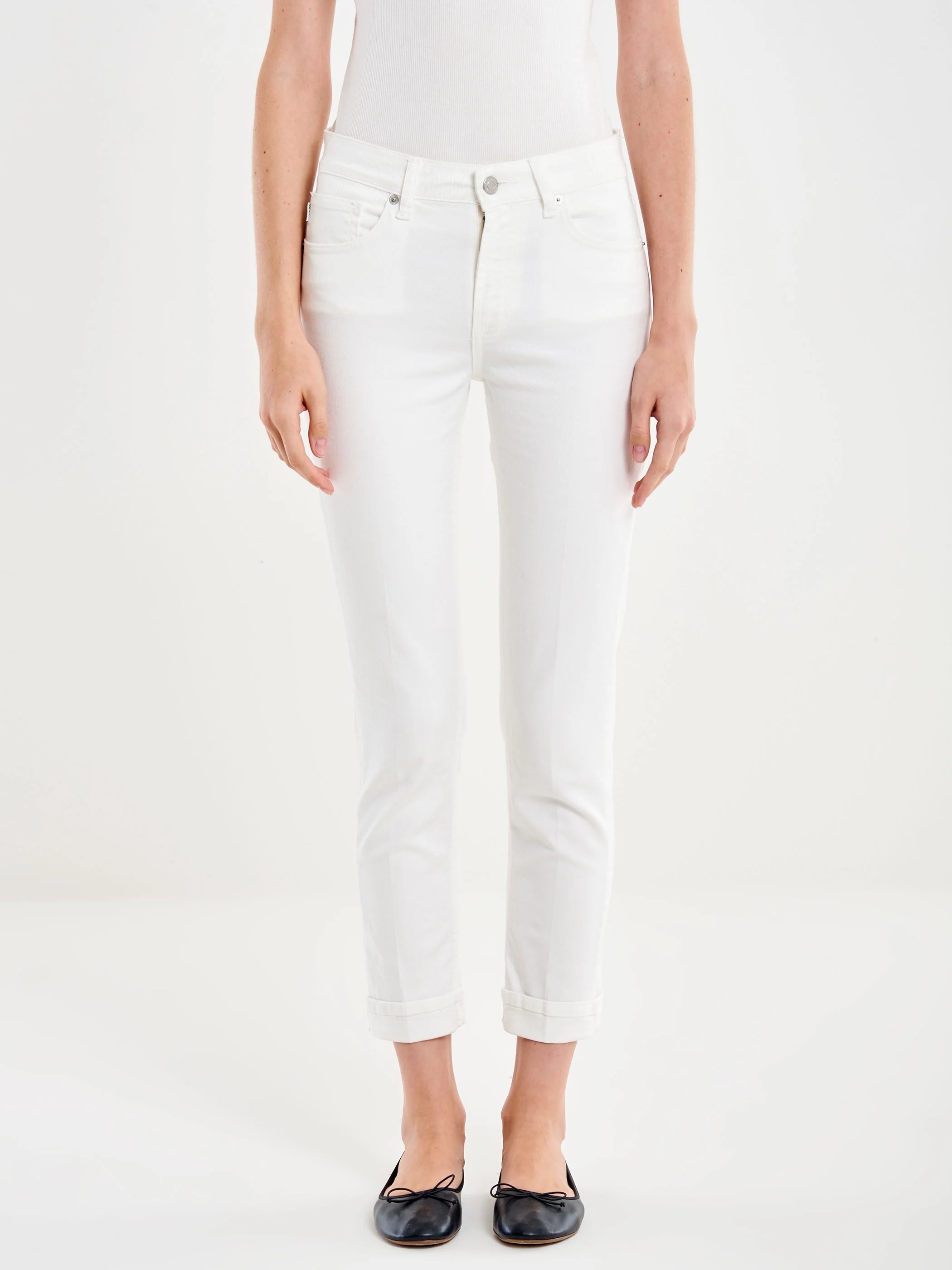 Jeans Icon Daisy cropped a vita media, slim fit. Modello cinque tasche. Chiusura con cerniera e bottone in metallo. Denim bianco. Dettaglio piega centrale frontale e posteriore. Dettaglio risvolto.